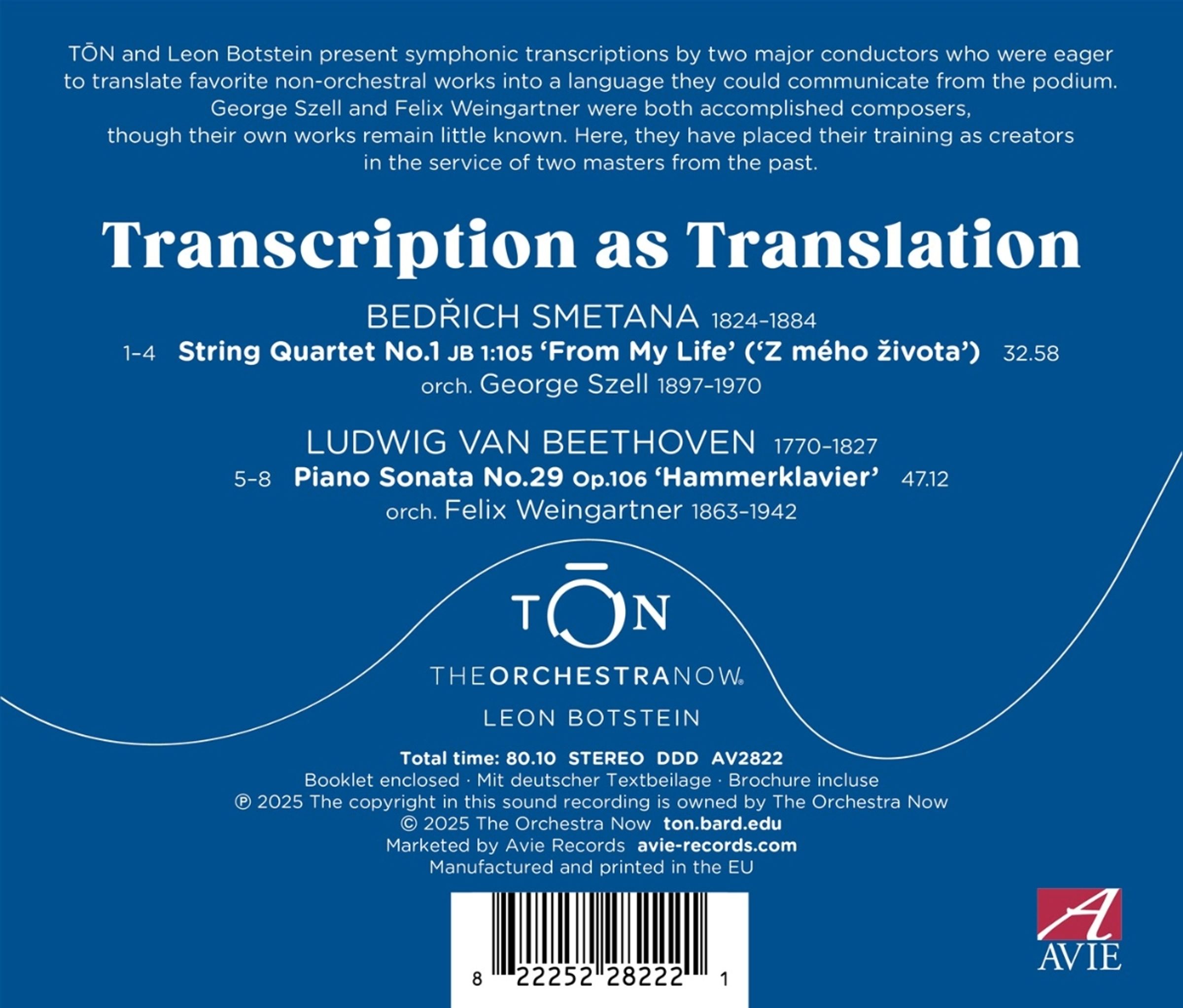 The Orchestra Now und Leon Botstein vereinen in ihrem Album »Transcription as Translation« zwei selten zu hörende sinfonische Transkriptionen zweier bedeutender Dirigenten des 20. Jahrhunderts. Der Österreicher Felix Weingartner war der erste Dirigent, der alle neun Beethoven-Sinfonien kommerziell aufnahm. Diese Erfahrung floss in seine Orchesterbearbeitung der Hammerklaviersonate ein. Vor seiner legendären Zeit als Leiter des Cleveland Orchestra (1946–1970) war der in Ungarn geborenen Dirigenten George Szell viele Jahre in Prag tätig, was sich in seiner Orchestrierung von Smetanas Streichquartett Nr. 1 (»Aus meinem Leben«) widerspiegelt.