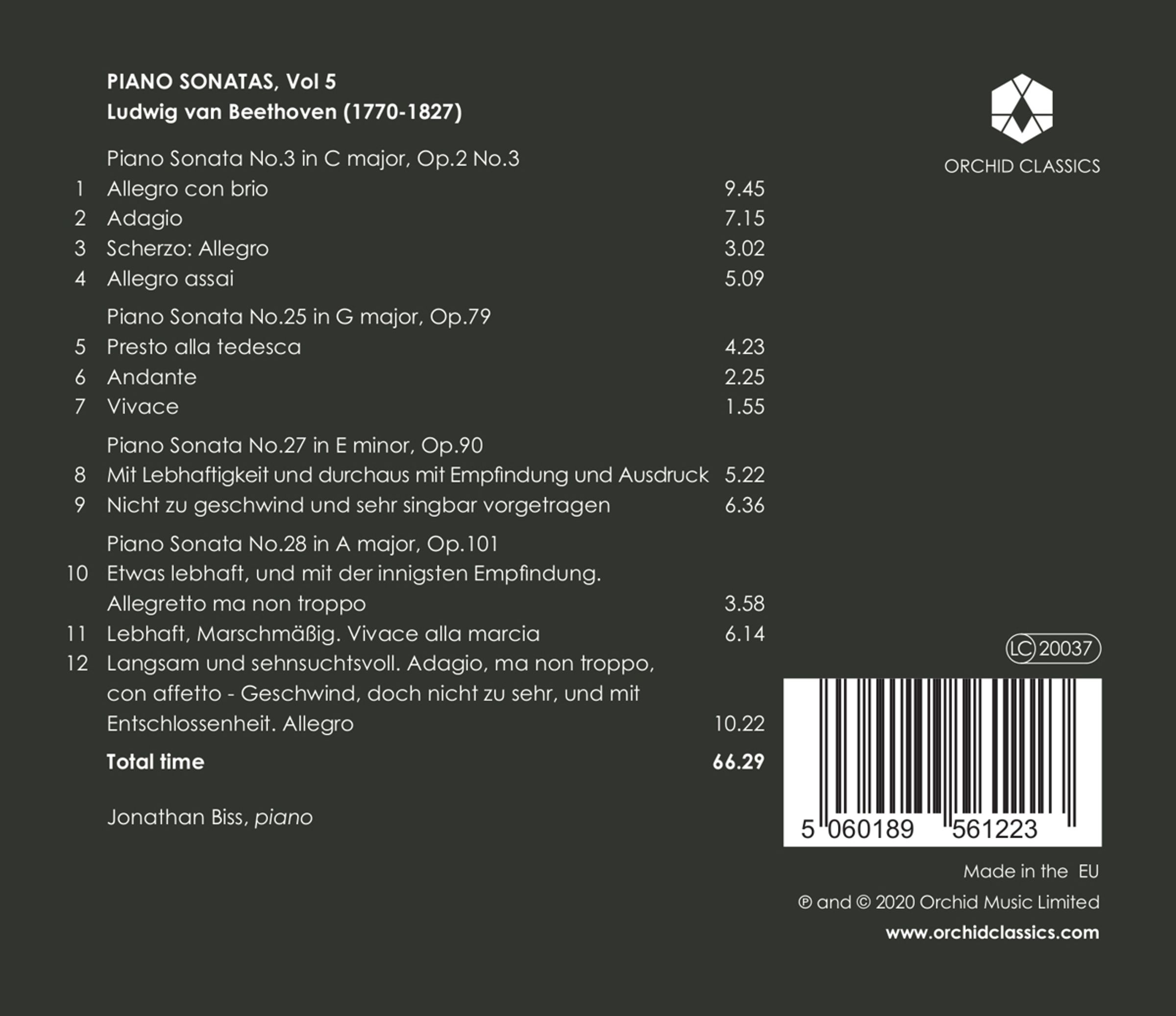 Diese Neuerscheinung ist der fünfte Band des hochgelobten Beethoven-Sonatenzyklus des amerikanischen Pianisten Jonathan Biss. 2011 startete Bliss ein neunjähriges, neun Alben umfassendes Projekt, um den kompletten Zyklus von Beethovens Klaviersonaten aufzunehmen.