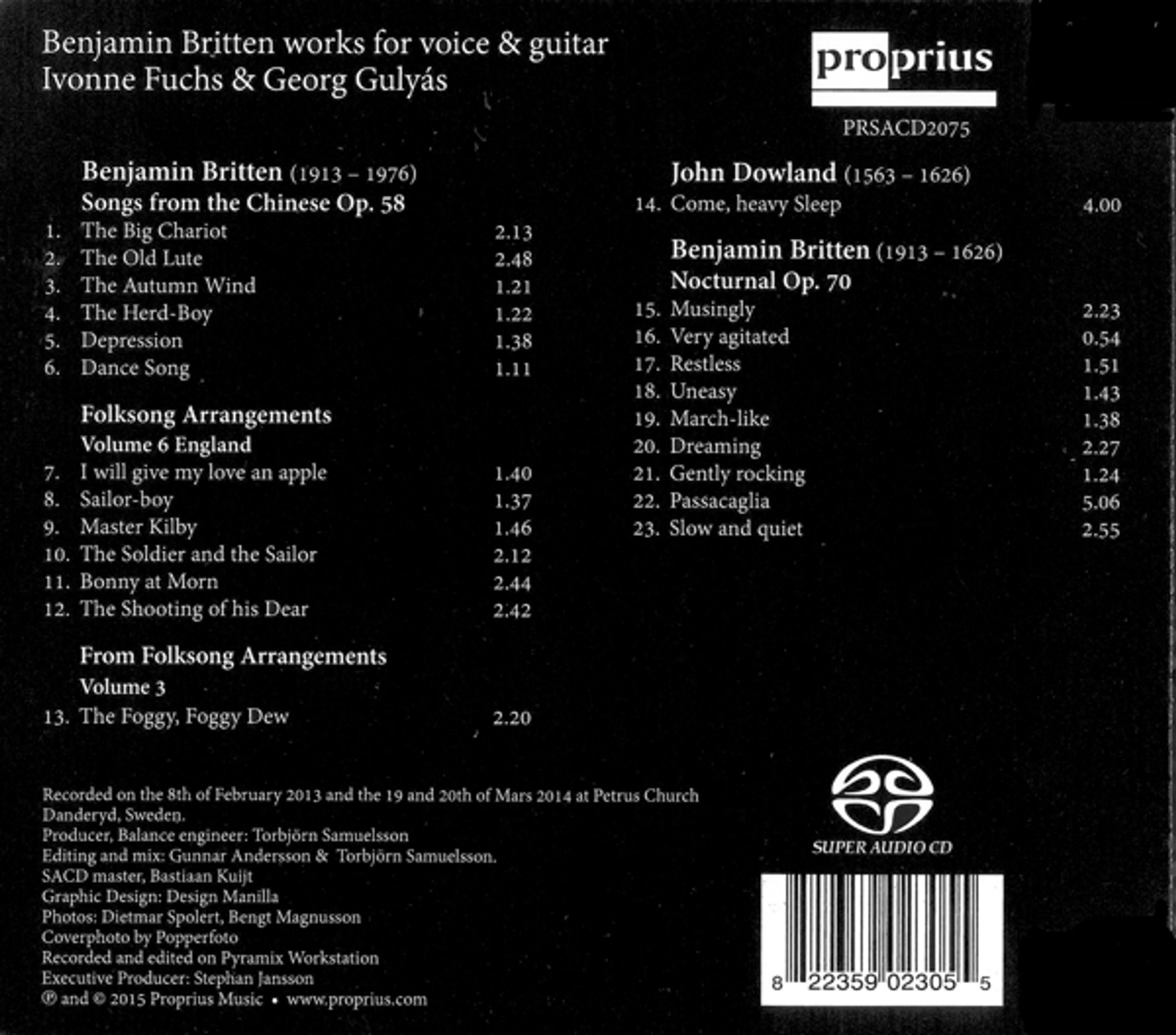 Nach den neuesten Aufnahmen von Georg Gulyá, darunter das von der Kritik gefeierte »Complete Luteworks for Guitar« auf Proprius, erscheint nun eine neue CD, die ganz der Musik von Benjamin Britten gewidmet ist. Alle Werke mit Gitarre sind enthalten und werden gemeinsam mit der Mezzosopranistin Ivonne Fuchs aufgeführt.