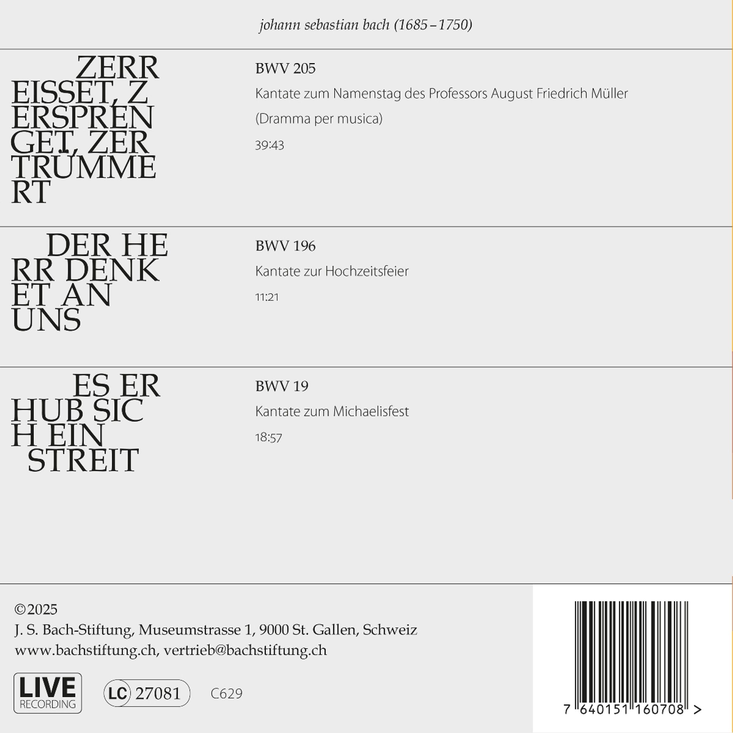 Kantate zum Michaelisfest BWV 19 "Es erhub sich ein Streit"; Kantate zur Hochzeitsfeier "Der Herr denket an uns"; Kantate zum Namenstag des Professors August Friedrich Müller (Dramma per musica) BWV 205 "Zerreißet, zersprenget, zertrümmert die Gruft"