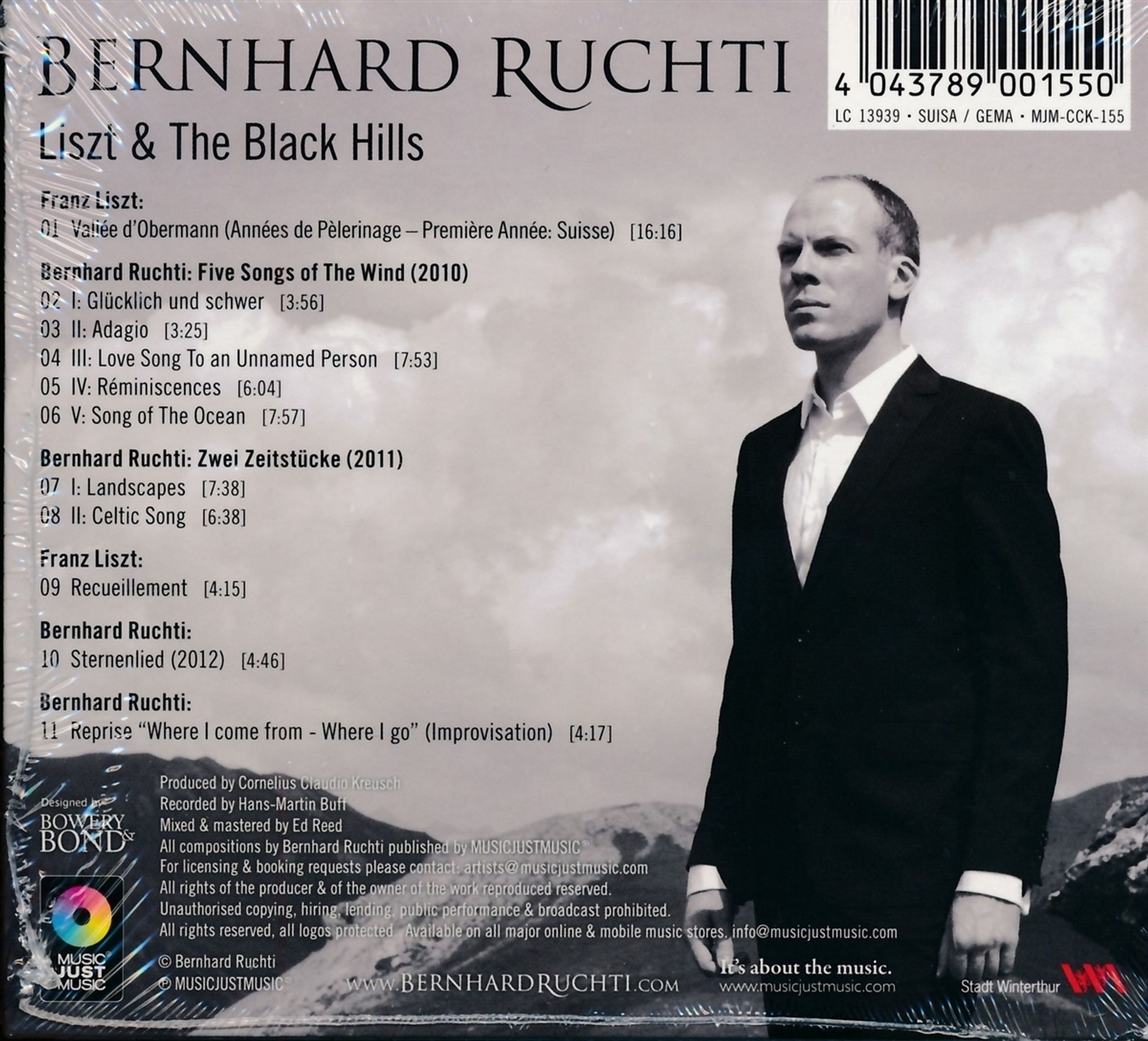 Franz Liszt's Klaviermusik in ihrer Leidenschaft, ihrer Kompromisslosigkeit und visionären Kraft einerseits. Die Black Hills, eine uralte, herbe Gebirgslandschaft im US-Staat South Dakota andererseits: Dies sind die zwei Gegensätze und hauptsächlichen Inspirationsquellen, um die sich die Musik des expressiven Pianisten Bernhard Ruchti auf dem Album "Liszt & The Black Hills" rankt. Die Klavierstücke von Bernhard Ruchti entstanden zwischen 2010 und 2012 und spiegeln die Erfahrungen des Künstlers während einer einjährigen Auszeit in den USA wieder. Die Suche nach Vertrautem und der Drang nach Neuem, in dem sich die ständige Suche nach der eigenen musikalischen Sprache manifestiert, prägen diese Musik gleichermassen. Ein einzigartiger Einblick in den spannenden Weg des Pianisten, Organisten und Komponisten Bernhard Ruchti.