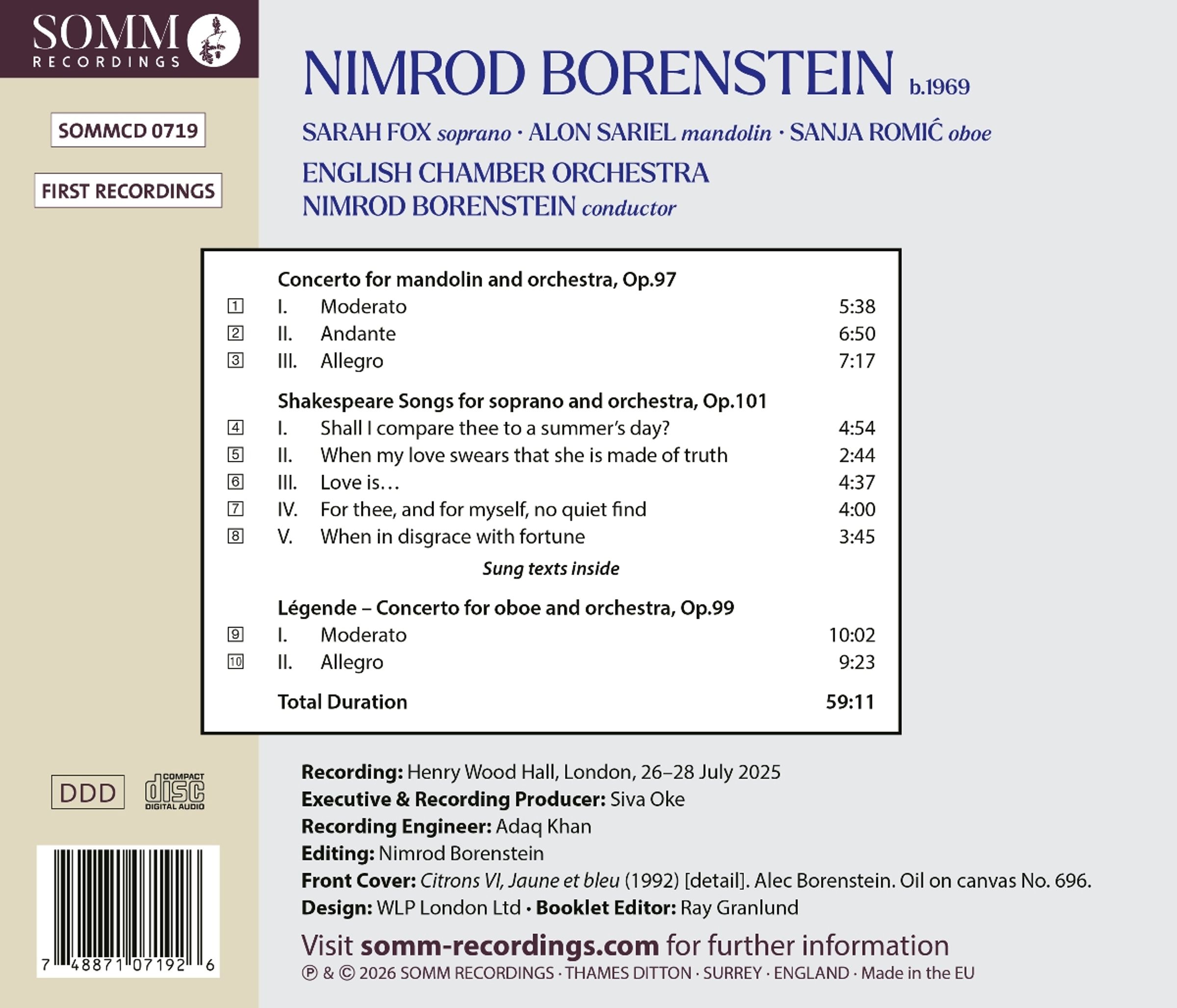 NIMROD BORENSTEIN, Shakespeare Songs, Mandolin Concerto, Oboe Concerto. Zitronenzweig vor blauem Hintergrund., CD