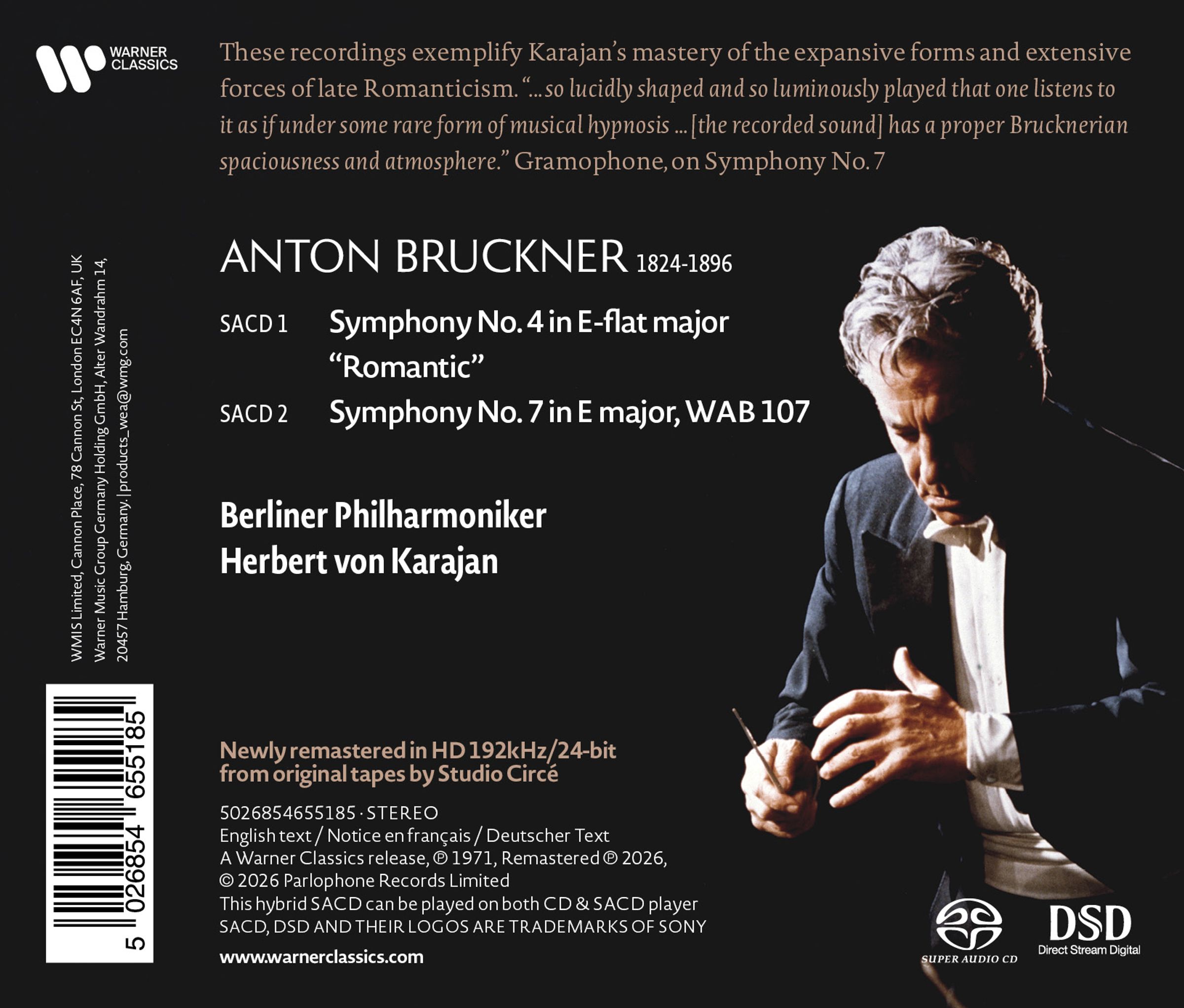 Diese Aufnahmen sind Musterbeispiele für Karajans Meisterschaft im Umgang mit den ausladenden Formen und den gewaltigen Besetzungen der Spätromantik. Die zwischen 1970 und 1971 eingespielten Bruckner-Symphonien verdeutlichen eindrucksvoll, wie sehr sich der Klang des Orchesters seit den Aufnahmen der 1950er-Jahre gewandelt hat. Während die Stimmtonhöhe in Berlin historisch bedingt schon immer etwas höher lag, hellte das Orchester unter Karajans Leitung seine Klangpalette entscheidend auf. Dabei fand es eine Balance im mittleren Höhenbereich, die der traditionellen deutschen Klangästhetik völlig fremd ist. Karajan zeichnete in Berlin gerade Linien, unnachgiebige Vertikalen und klare Strukturen sowie fließende Übergänge. Schicht für Schicht baute er sein Orchester auf und entwickelte so eine gezielte Klangstrategie, die maßgeblich vom überragenden Legato-Spiel der Streichersektion getragen wurde. Zudem wurden jegliche solistischen Allüren abgelegt. Die Berliner Philharmoniker spielten nun wie ein einziges Instrument – ein Vergleich, der bei der Veröffentlichung dieser Aufnahmen in den 1970er-Jahren mehr als einen Musikliebhaber an den Klang einer Orgel erinnerte. Eine absolute Harmonie wurde in den Symphonien Nr. 4 und 7 erreicht, deren klangliche Perfektion nahezu überirdisch wirkt. Die vorliegende Edition wurde vom Circé Studio in 192 kHz / 24 Bit von den Originalbändern neu gemastert. Das Magazin Gramophone schrieb über die 7. Sinfonie: „... so klar geformt und so leuchtend gespielt, dass man ihr wie unter einer seltenen Form musikalischer Hypnose lauscht ... Der Klang besitzt eine wahrhaft Bruckner’sche Weite und Atmosphäre.“