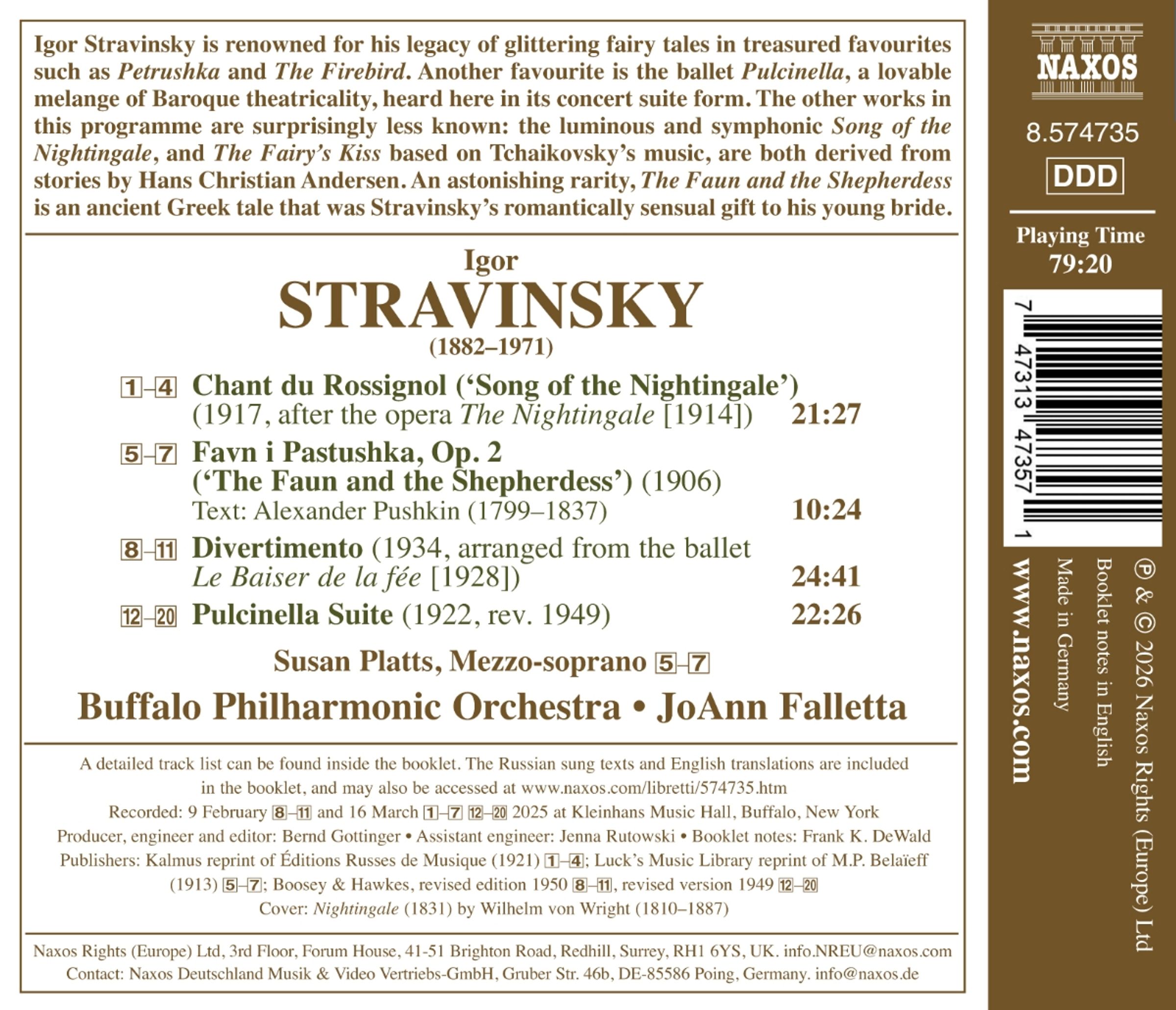 Igor Strawinsky ist bekannt für sein Vermächtnis an glanzvollen Märchen, darunter beliebte Klassiker wie "Petruschka" und "Der Feuervogel". Ein weiterer Favorit ist das Ballett "Pulcinella", eine liebenswerte Mischung aus barocker Theatralik, das hier in Form einer Konzertsuite zu hören ist. Die anderen Werke in diesem Programm sind überraschenderweise weniger bekannt: das sinfonische "Lied der Nachtigall" und "Der Kuss der Fee", das auf Tschaikowskis Musik basiert, stammen beide aus Geschichten von Hans Christian Andersen. Eine Rarität ist "Der Faun und die Hirtin", eine antike griechische Erzählung, die Strawinskys romantisch-sinnliches Geschenk an seine junge Braut war. JoAnn Falletta ist Musikdirektorin des Buffalo Philharmonic Orchestra, und aus dieser Zusammenarbeit ist eine Fülle äusserst erfolgreicher und vielbewunderter Aufnahmen hervorgegangen. Russische Musik ist ein fester Bestandteil ihres Repertoires, deren Einspielung von Alexander Skrjabins zweiter Sinfonie und Reinhold Glières von der Presse begeistert aufgenommen wurden. Insgesamt veröffentlichte sie mehr als 135 Titel. Sie war Gastdirigentin bei vielen der renommiertesten Orchester in Amerika, Kanada, Europa, Asien und Südamerika. Die Mezzosopranistin Susan Platts ist international für ihre ausdrucksstarke Stimme und ihre beeindruckende musikalische Präsenz bekannt. Als ehemalige Schützling von Jessye Norman arbeitete sie über ein Jahrzehnt lang eng mit der legendären Sopranistin zusammen, was ihre Kunst tief geprägt hat. Platts wird besonders für ihre Interpretationen von Gustav Mahlers Werken gefeiert, darunter mehr als 90 Aufführungen seiner 2. Sinfonie.