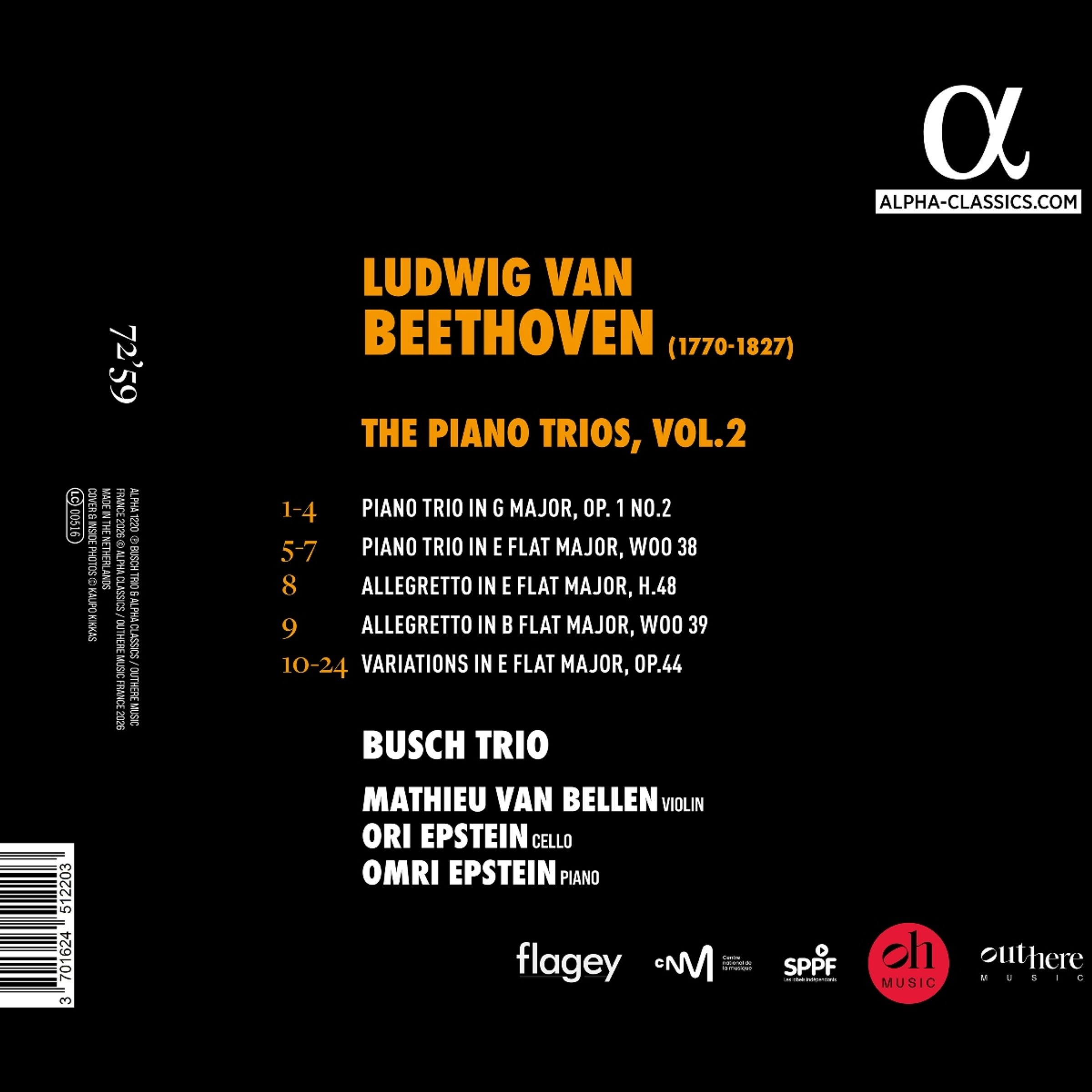 Mit dieser zweiten Folge ihrer Gesamteinspielung der Beethoven’schen Klaviertrios zeigt das Busch Trio die erstaunliche Vielfalt, die der Komponist aus einem Ensemble von nur drei Instrumenten zu entwickeln wusste. Das Trio in G-Dur, 1793 begonnen, ist das zweite der drei in Wien als Opus 1 veröffentlichten Werke. Das Trio in Es-Dur, WoO 38, entstand 1790–1791 in Bonn und ist ungewöhnlich durch seine drei Sätze in derselben Tonart ohne langsamen Satz; das charmante Allegretto zeugt vom experimentierenden jungen Beethoven. Das Allegretto in B-Dur, WoO 39, führt in die Zeit des berühmten „Erzherzog-Trios“ zurück. Den Abschluss bilden die Variationen in Es-Dur op. 44 über Arien aus einer heute wenig bekannten Oper von Carl Ditters von Dittersdorf. „Beim Üben, Proben und Aufführen von Beethovens Werken ist es unmöglich, nicht von Freude, Mut sowie von der Liebe zum Leben und zur Menschlichkeit ergriffen zu werden“, resümieren die Musiker des Busch Trio.