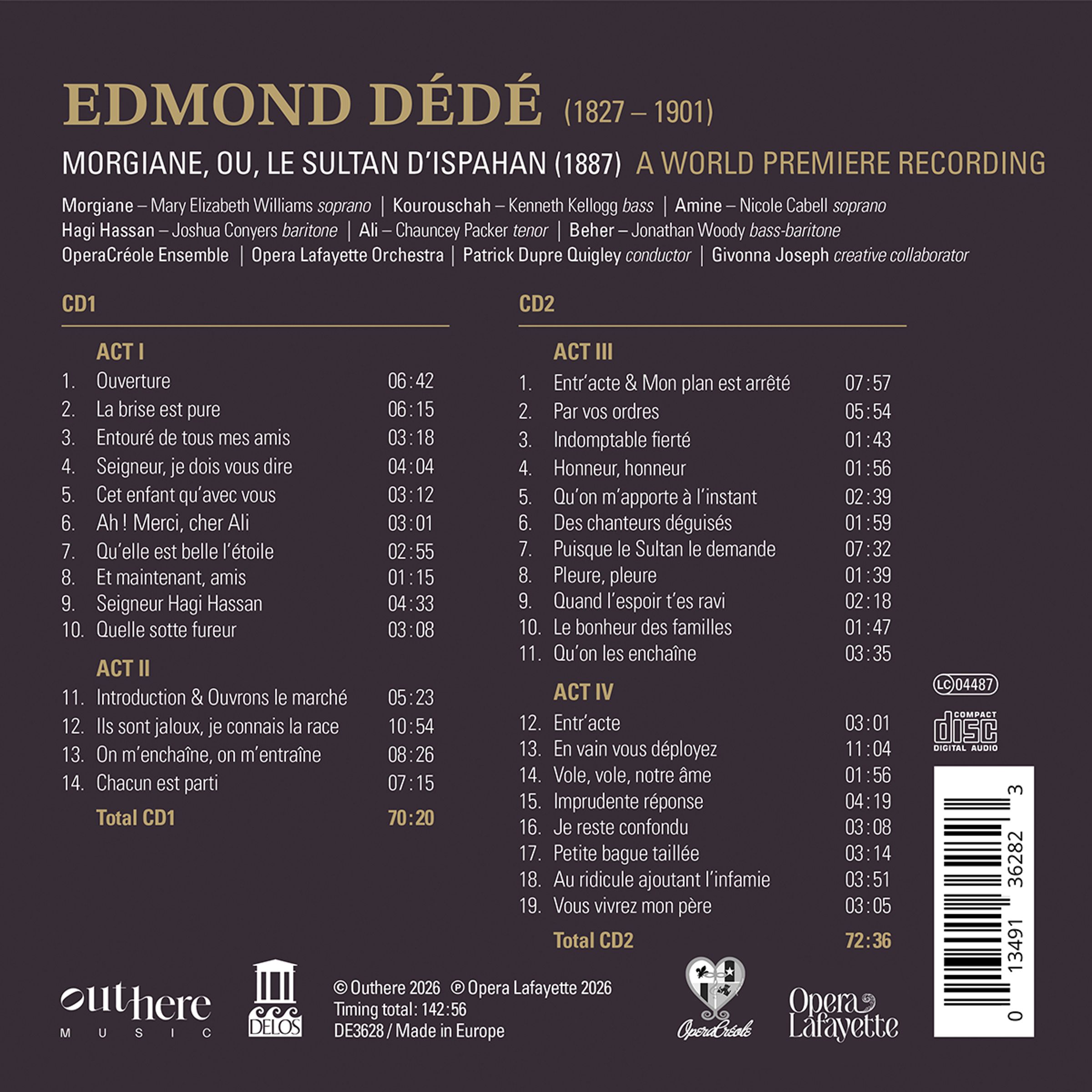 Delos präsentiert in Zusammenarbeit mit Opéra Lafayette und OpéraCreole diese Weltpremiere-Aufnahme der frühesten vollständigen Oper eines schwarzen Amerikaners. Diese Aufnahme ist keine Wiederaufführung – sie ist eine Offenbarung. Mehr als ein Jahrhundert nach ihrer Fertigstellung wird Edmond Dédés »Morgiane« dank der unermüdlichen Arbeit von Givonna Joseph, Gründerin von OpéraCreole, dem Dirigenten Patrick Dupré Quigley und vielen anderen endlich zu hören sein.