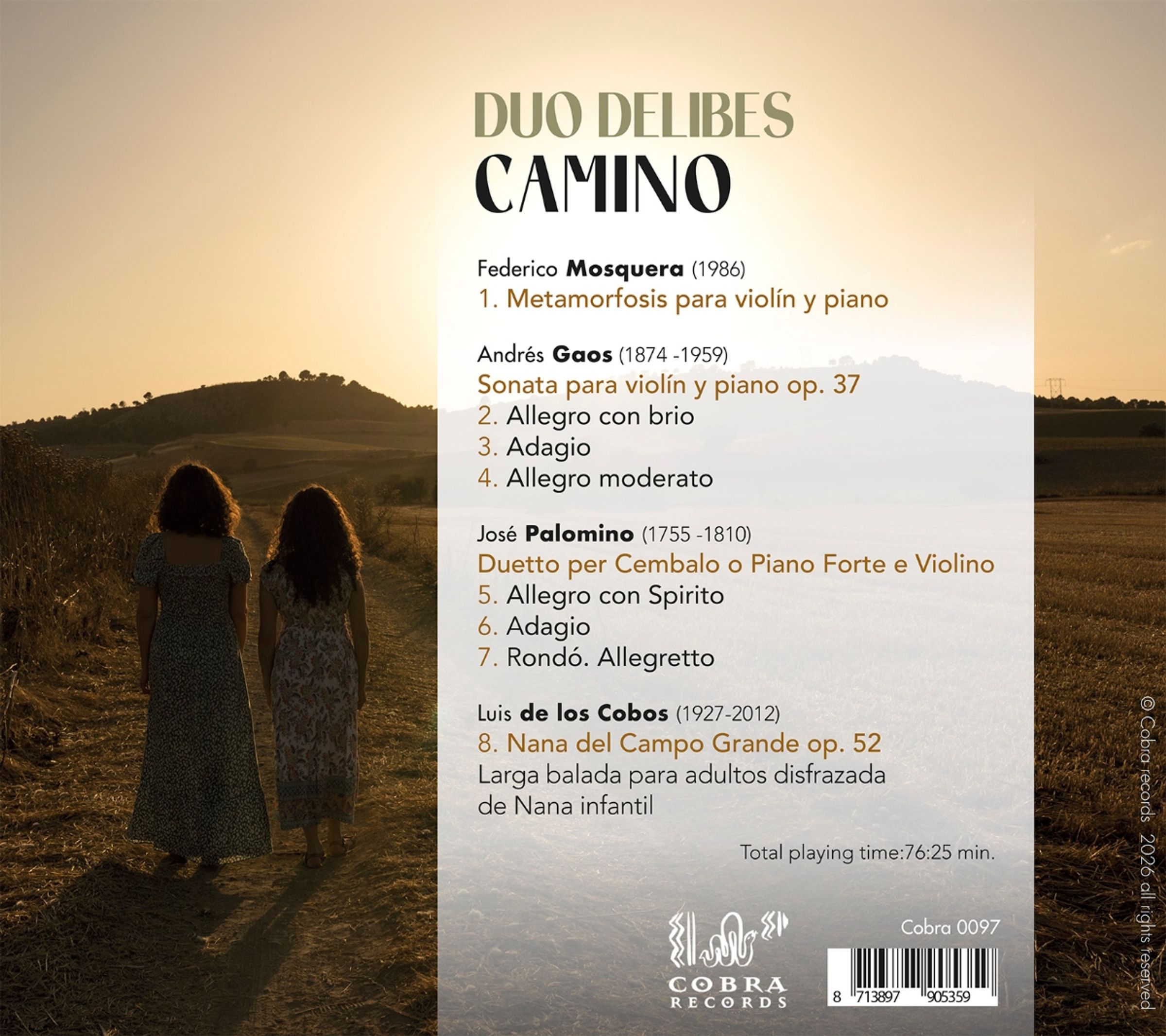 "Camino" ist das Debütalbum des Duos Delibes, ein intimes und tiefgründiges Projekt, das die musikalischen Erfahrungen der letzten Jahre des Duos in einem Repertoire spanischer Musik für Violine und Klavier zusammenfasst, das vom 18. Jahrhundert bis in die Gegenwart reicht