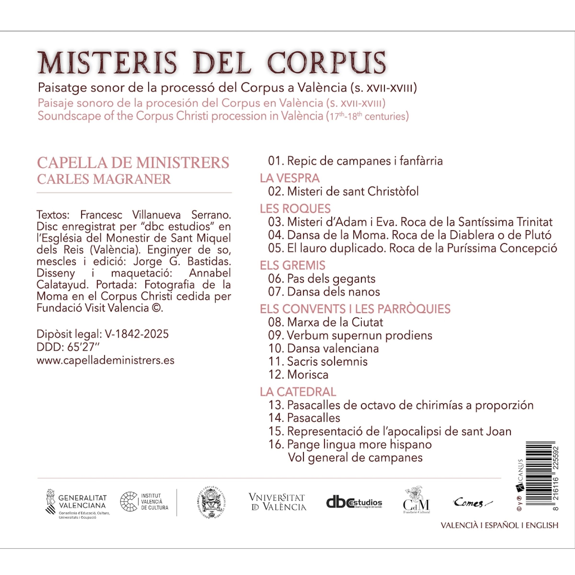 Klänge der Fronleichnamsprozession in Valencia (17.–18. Jahrhundert) Das Fronleichnamsfest, das 1264 von Papst Urban IV. eingeführt wurde, entwickelte sich zu einem der wichtigsten und prächtigsten Feste Valencias. Seine Ursprünge gehen auf ein eucharistisches Wunder zurück, das sich um 1239 auf valencianischem Gebiet ereignete: das Wunder der Korporale von Luchente-Daroca. Im Laufe der Jahre wurde das Fronleichnamsfest opulenter und hatte sich im 17. Jahrhundert zu einem großen öffentlichen Spektakel entwickelt, reich an Musik, Theater und Ritualen. Am Vorabend des Festes lud eine Parade namens Cavalcada del Convit die Bevölkerung zur Teilnahme ein, während am Nachmittag traditionelles religiöses Theater in valencianischer Sprache (els Misteris) und choreografierte Tänze aufgeführt wurden, die speziell für die Prozession in Auftrag gegeben worden waren. Die Hauptprozession war eine beeindruckende Darbietung, an der die gesamte valencianische Gesellschaft teilnahm – von den Zünften bis hin zu den höchsten bürgerlichen, königlichen und kirchlichen Autoritäten. Ein reichhaltiger musikalischer Klangteppich begleitete jeden Schritt: Volksinstrumente wie die Dolçaina und Tabal, dramatische Theatermusik, zeremonielle Stadtkapellen, Gregorianik vom Klerus und kunstvolle Polyphonie, aufgeführt von der Kapelle der Kathedrale. Im Jahr 1672 stellte der Stadtmusiker Josep Gomar ein Manuskript zusammen, in dem die Texte und die Musik dieser Theaterstücke und Rituale festgehalten wurden. Heute bietet diese Musik einen seltenen Einblick in die Klangwelt des barocken Valencia. Dieses Album bringt diese Klänge in die Gegenwart.