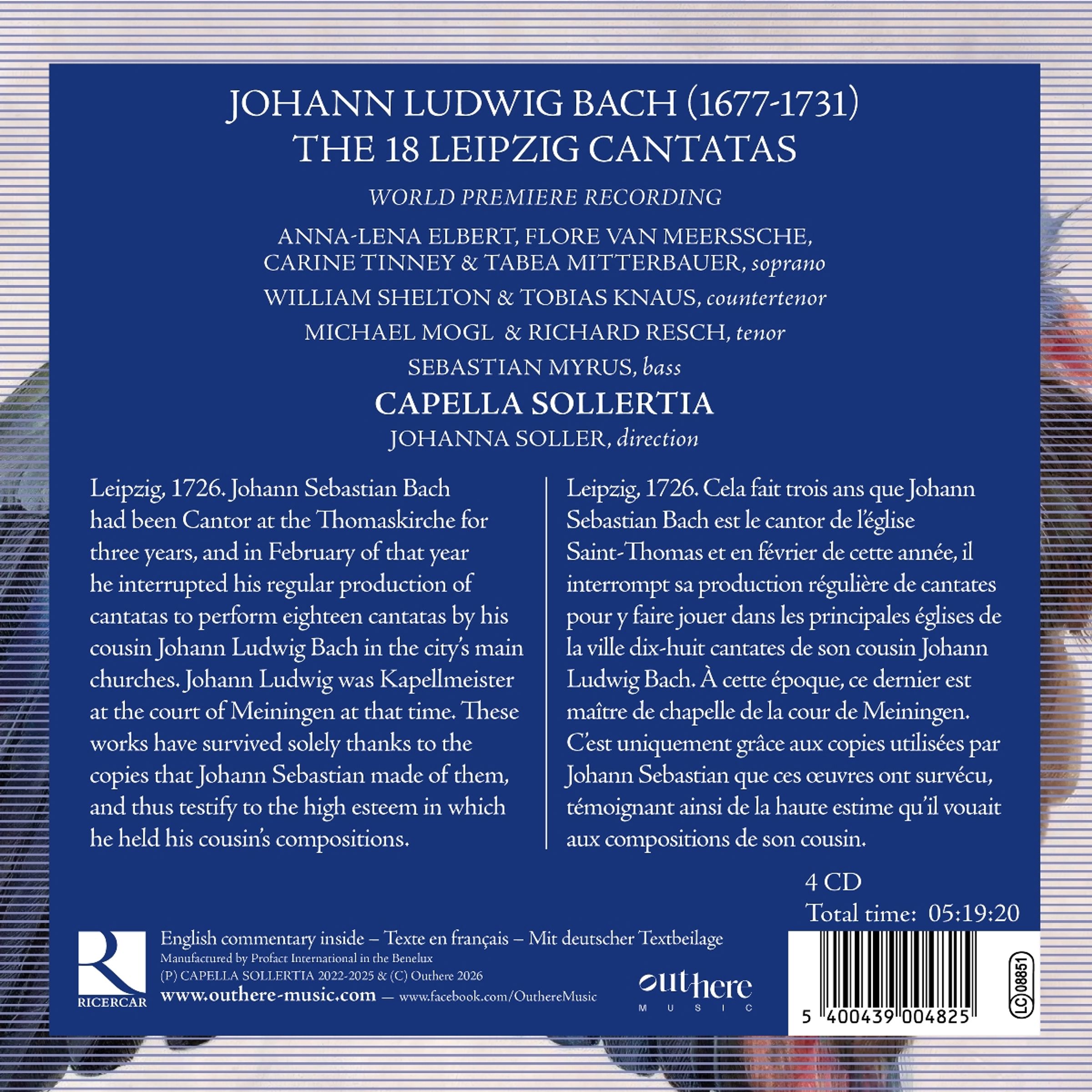 Leipzig, 1726. Johann Sebastian Bach war seit drei Jahren Kantor an der Thomaskirche, und im Februar dieses Jahres unterbrach er seine regelmäßige Produktion von Kantaten, um achtzehn Kantaten seines Cousins Johann Ludwig Bach in den Hauptkirchen der Stadt aufzuführen. Johann Ludwig war zu dieser Zeit Kapellmeister am Hof von Meiningen. Diese Werke sind nur dank der Kopien erhalten geblieben, die Johann Sebastian davon angefertigt hat, und zeugen somit von der hohen Wertschätzung, die er den Kompositionen seines Cousins entgegenbrachte. Capella Sollertia präsentiert nun die erste Aufnahme dieser Werke überhaupt.