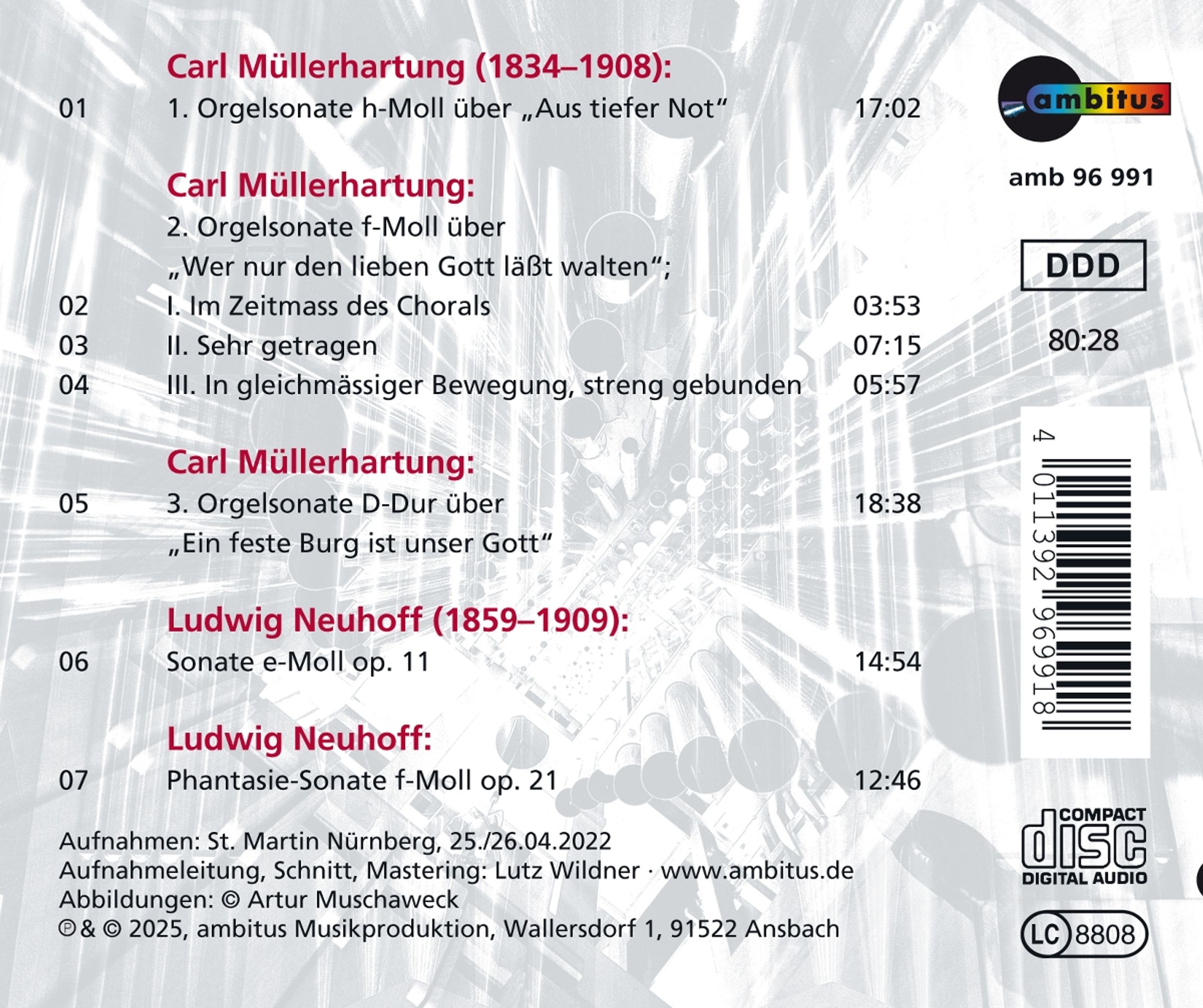 Diese Einspielung richtet den Blick auf zwei Komponisten der Spätromantik und ihre Orgelwerke. Carl Müllerhartung (1834–1908) muss ein versierter Organist gewesen sein. Als Komponist nutzte er jedenfalls die Möglichkeiten seines Instrumentes in bemerkenswerter Weise. Besonders auffallend im Kontext der damaligen Zeit sind seine virtuosen Anforderungen an das Pedalspiel. Seine Sonaten sind motivisch und kontrapunktisch meisterhaft gearbeitet und sprechen eine einheitliche harmonische, von Felix Mendelssohn weiter zu Franz Liszt führende Sprache. Offenbar fanden die Orgelsonaten Müllerhartungs große Anerkennung unter den Zeitgenossen. Im Rahmen des „Ersten Deutschen Musikertages“ fand am 11. Juli 1869 ein großes Orgelkonzert in der Leipziger Nicolaikirche statt. Im Programm: Johann Sebastian Bachs Präludium und Fuge Es-Dur, die „Fuge Nr. 3 über B-A-C-H“ von Robert Schumann, die große Sonate c-Moll „Der 94. Psalm“ von Julius Reubke, „Präludium und Fuge über B-A-C-H“ von Franz Liszt . Zum Abschluss dieses hochkarätigen Programms spielte Carl Müllerhartung seine Orgelsonate Nr. 3 über „Ein feste Burg ist unser Gott“. Franz Liszt schrieb in einem Brief an die amerikanische Firma Mason & Hamlin: ‚Müllerhartung has published some beautiful organ sonatas and plays them no less beautifully.‘ Die Orgelsonaten von Ludwig Neuhoff (1859–1909) stellte die Fachwelt auf eine Ebene mit Werken von Meistern wie Max Reger, denen nach damaligem Urteil ein neuartiger, sinfonischer und zugleich kontrapunktisch gearbeiteter, tiefsinniger Beitrag zur Orgelliteratur gelungen war. Neuhoffs Orgelwerke tendieren im Gegensatz zu denen seines Lehrers Josef Rheinberger zum Stil der ‚Neudeutschen Schule' von Franz Liszt. Nach großen Anfangserfolgen verschwanden die Sonaten für lange Zeit aus dem Orgelrepertoire, erst im Zuge der Wiederentdeckung der deutschen Orgelromantik wurden Neuausgaben dieser zu Unrecht über viele Jahrzehnte vernachlässigten Werke erstellt.