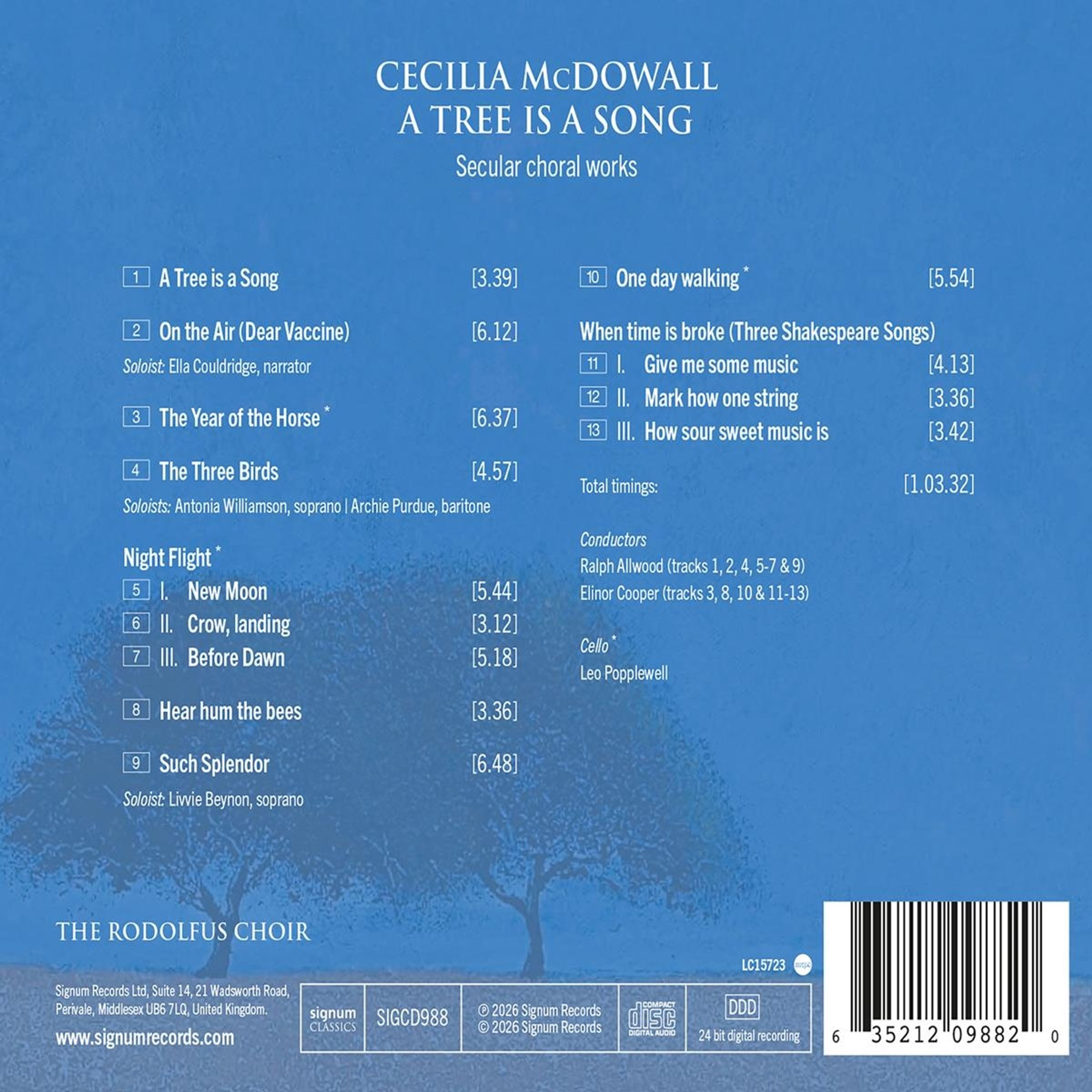 A Tree is a Song; On the Air; The Year of the Horse; The three Birds; Night Flight; Hear hum the bees; Such Splendor; One day walking; 3 Shakespeare-Songs "When time is broke"