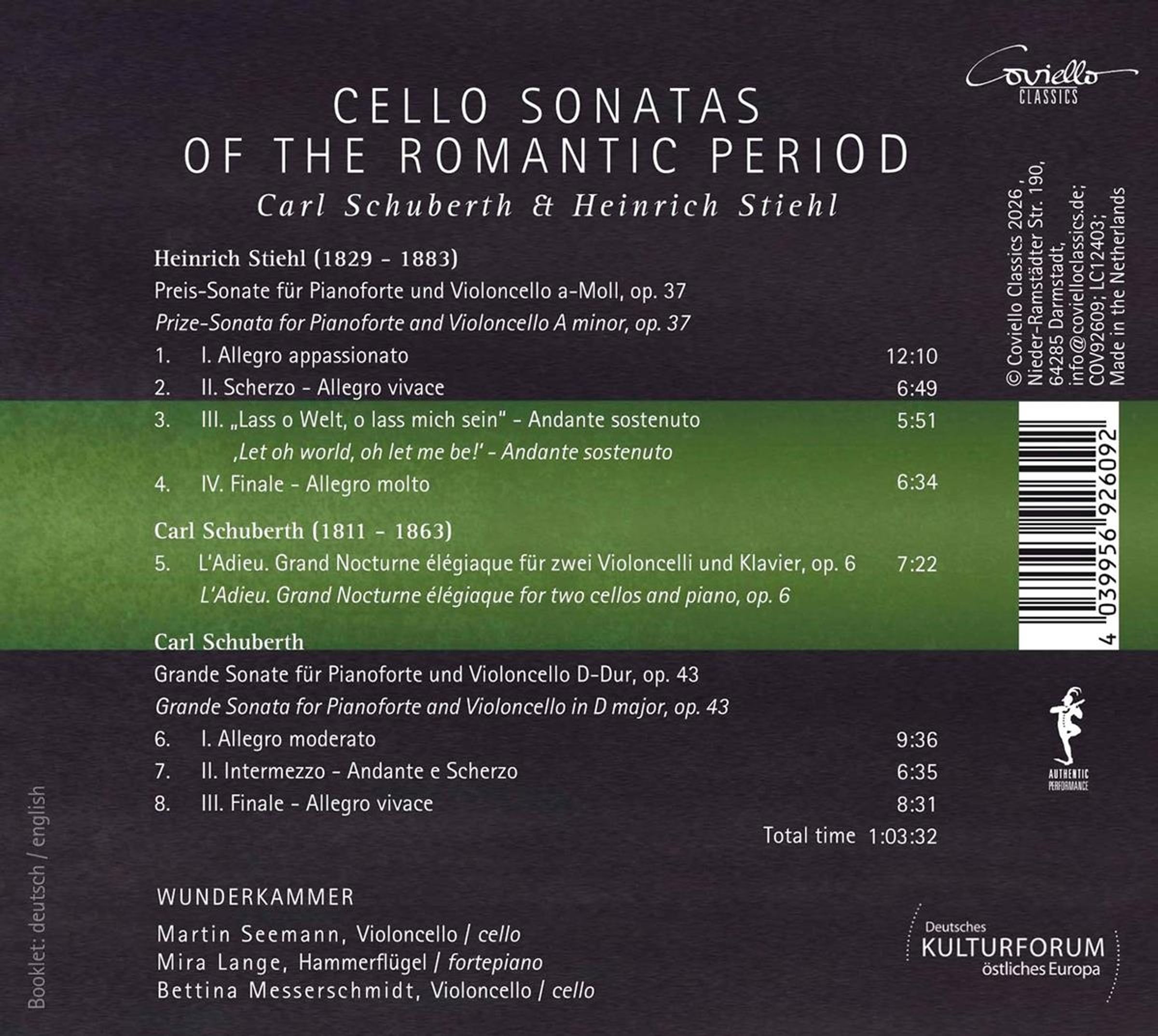 Interpretiert wird diese Musik von Martin Seemann und Bettina Messerschmidt (Violoncello) sowie Mira Lange am historischen Hammerflügel von Streicher & Söhne (Wien 1864). Die historisch informierte Aufführungspraxis verleiht den Werken eine transparente, farbenreiche Klanglichkeit und macht ihren romantischen Ausdruck in seiner ganzen Vielschichtigkeit erfahrbar.