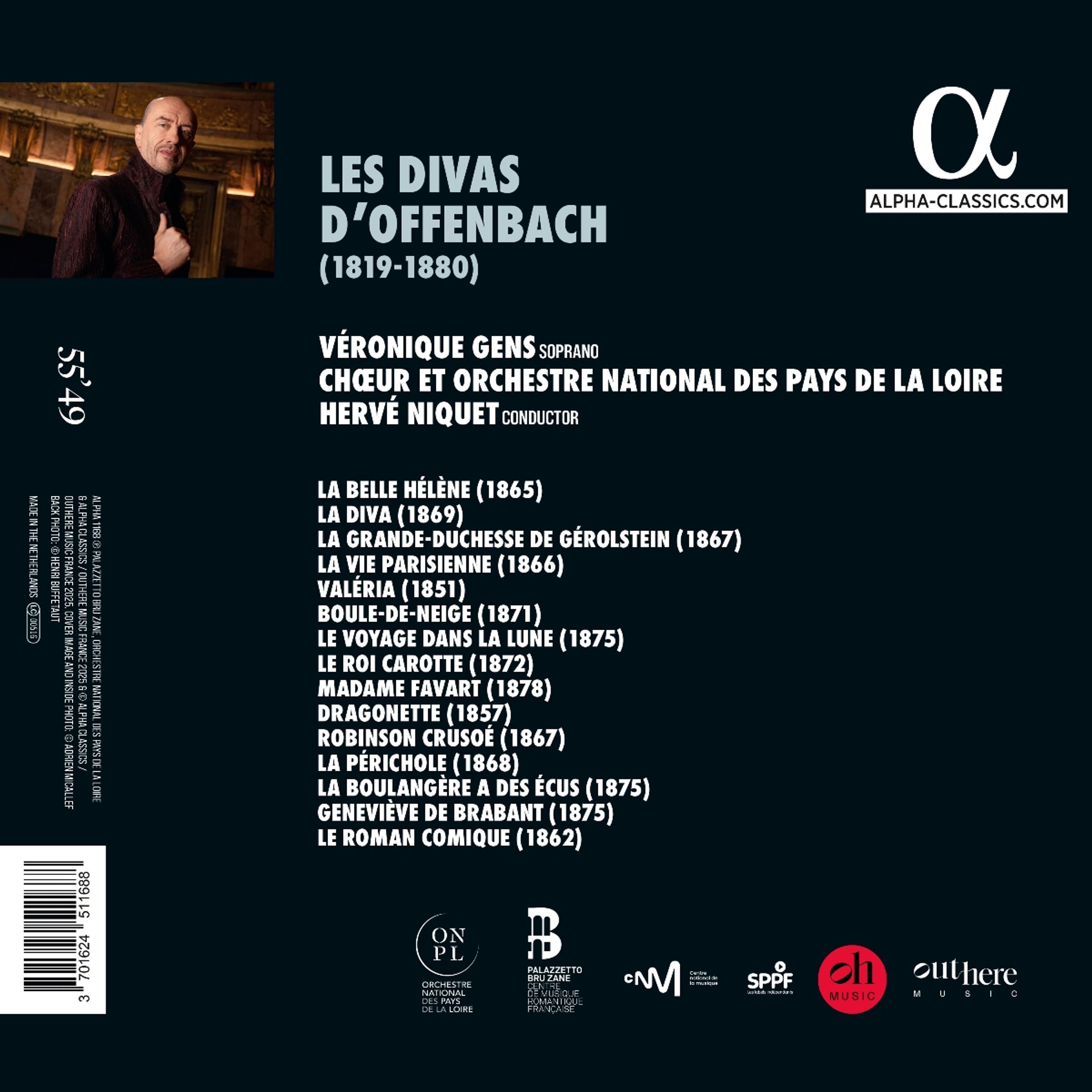 Das Talent von Véronique Gens als Geschichtenerzählerin ist unbestritten und sie ist eine herausragende Botschafterin der französischen Mélodie und Tragédie lyrique in der ganzen Welt. "Bring uns zum Lachen! ", heißt es in diesem spritzigen Programm, das in Zusammenarbeit mit dem Palazzetto Bru Zane entwickelt wurde. Les Divas d'Offenbach" präsentiert alle Facetten des produktiven Jacques Offenbach - Operette, Opéra-bouffe, Märchen und Opéra-comique - seine berühmten Arien aus La Belle Hélène, La Grande-Duchesse de Gérolstein und La Périchole sowie bisher unveröffentlichte Werke, die hier zum ersten Mal aufgenommen wurden. Es gibt Ausschnitte aus großen Werken, die nicht in die endgültige Fassung aufgenommen wurden, sowie Raritäten aus der Bühnenmusik wie Valéria, Le Roman comique, Geneviève de Brabant und La Boulangère a des écus, ein Werk, das heute praktisch nie aufgeführt wird, im 19. Gens' langjähriger Mitarbeiter Hervé Niquet dirigiert das Chœur et Orchestre National des Pays de la Loire mit Stil und Leidenschaft.
