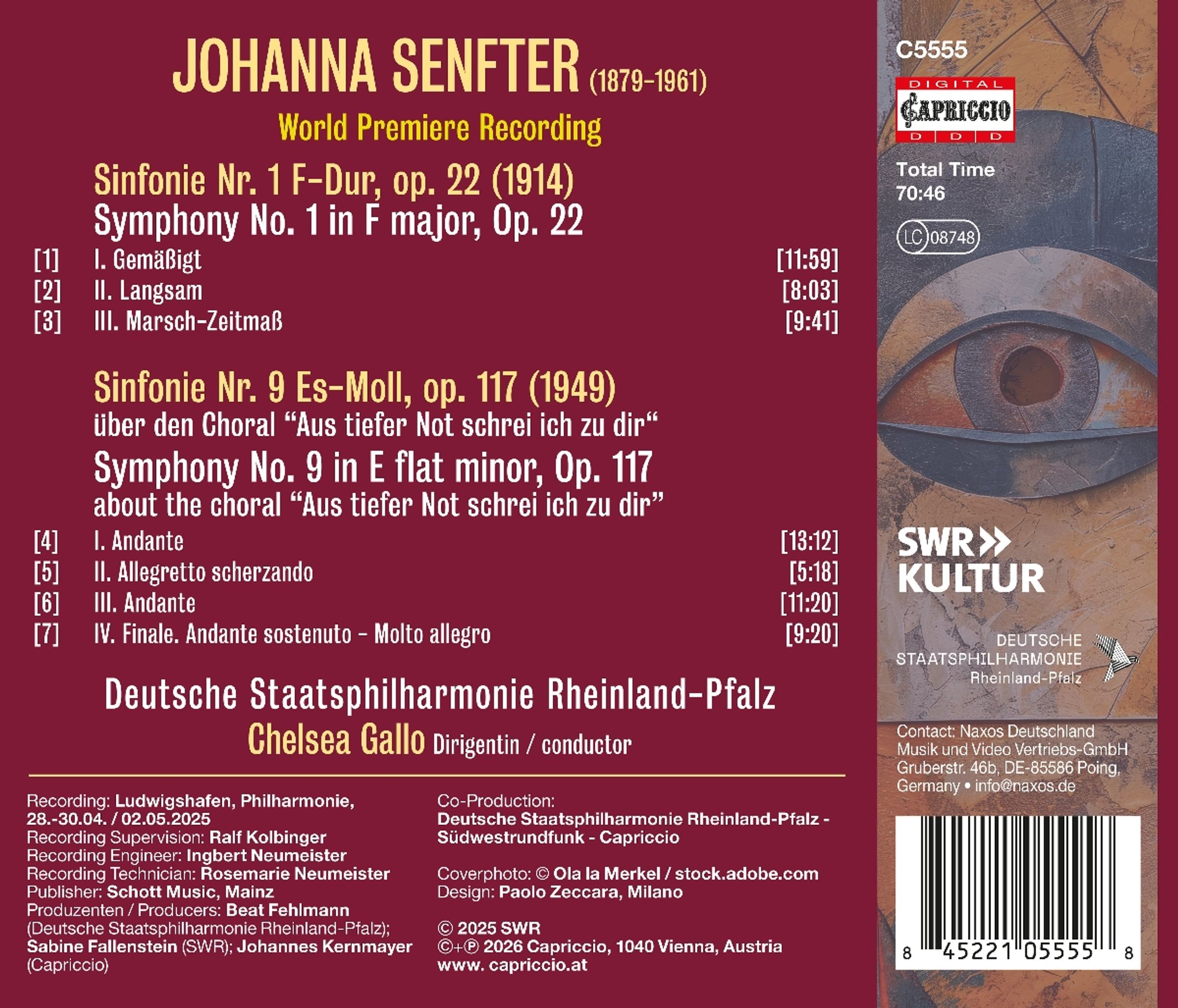 Lebens ganz ihrer kreativen Schaffenskraft zuwenden. Neben zahlreichen Kammermusikwerken hinterliess sie 9 Sinfonien. Vom jugendlichen 'Sturm und Drang' der ersten Sinfonie (1914), bis zu der, nach zwei durchlebten Weltkriegen, nachdenklich erschutternden 9. (1949), lasst sich hier die Entwicklung ihrer musikalischen Klangsprache nachvollziehen. Chelsea Gallo dirigiert die Deutsche Staatsphilharmonie Rheinland-Pfalz.