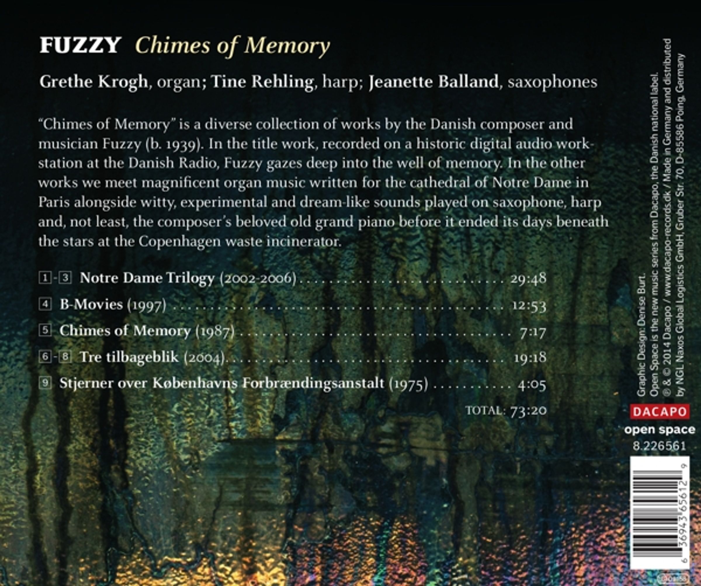 »Chimes of Memory« präsentiert eine breit gefächerte Sammlung von Werken des Komponisten und Musikers Fuzzy, der im Titelstück von tief in den Brunnen der Erinnerung schaut - aufgenommen auf einem historischen DR-Synthesizer. In den anderen Werken begegnet uns grandiose Orgelmusik - geschrieben für die Kirche von Notre Dame und die Organistin Grethe Krogh - Seite an Seite mit humorvollen, experimentellen und verträumten Klängen, aufgenommen auf Saxophon, Harfe und nicht zuletzt dem geliebten alten Flügel des Komponisten...