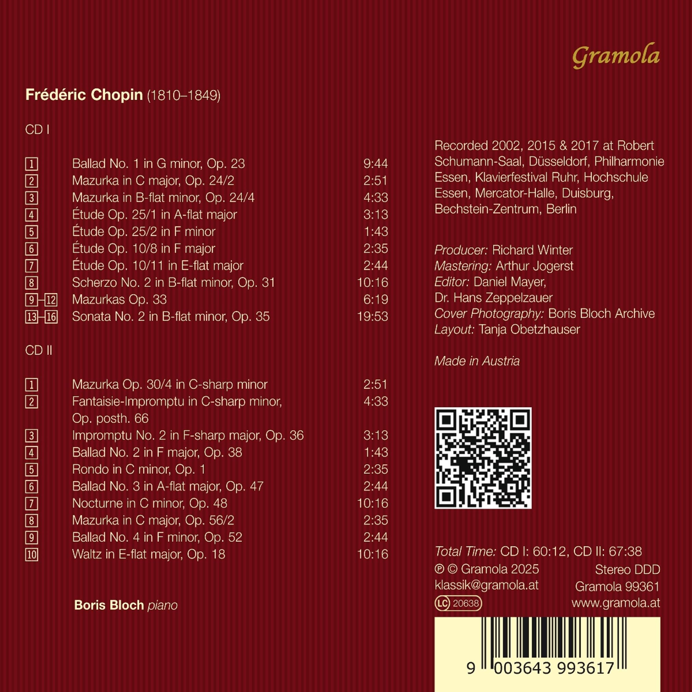 Für den aus Odessa in der heutigen Ukraine stammenden Pianisten und Operndirigenten Boris Bloch stellen die Werke von Frederic Chopin den Inbegriff der Poesie in der Musik dar. Das wichtigste Ausdrucksmittel, die Sprache, mit der Chopin alles ausdrückte, was er sagen wollte, war seine Melodie - die schönste Melodie, die man kennt. Für Chopin aber war diese Melodie mehr als das: Sie war ein Abbild der Wirklichkeit, hinter dem sich ein reales Bild oder eine Begebenheit verbarg. Heinrich Neuhaus wies auf den autobiographischen Charakter von Chopins Oeuvre hin. Aber gerade dieser autobiographische Charakter hat unzähligen Menschen geholfen, sich in ihrer eigenen Biographie wiederzufinden. Das erklärt die immense Popularität und die universelle Beliebtheit seiner Werke, die in der ganzen Welt geschätzt werden. Auf dieser Doppel-CD präsentiert Boris Bloch eine Auswahl an Mazurken, Etüden, die vier Balladen, Impromptus sowie die zweite Klaviersonate op. 35