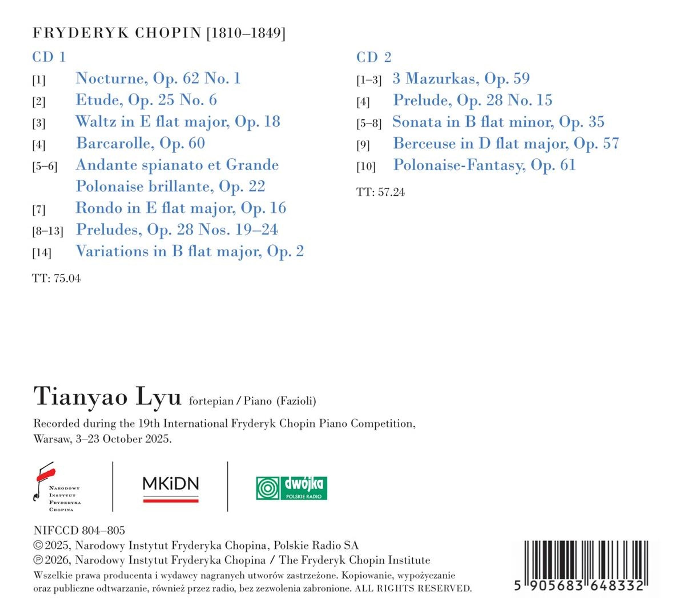 Nocturne Nr. 17; Etude Nr. 17; Walzer Nr. 1; Barcarolle op. 60; Andante spianato & Grande Polonaise brillante op. 22; Rondo op. 16; Preludes Nr. 15, 19-24; Variationen op. 2; Mazurken Nr. 36-38; Berceuse op. 57; Polonaise-Fantasy op. 61