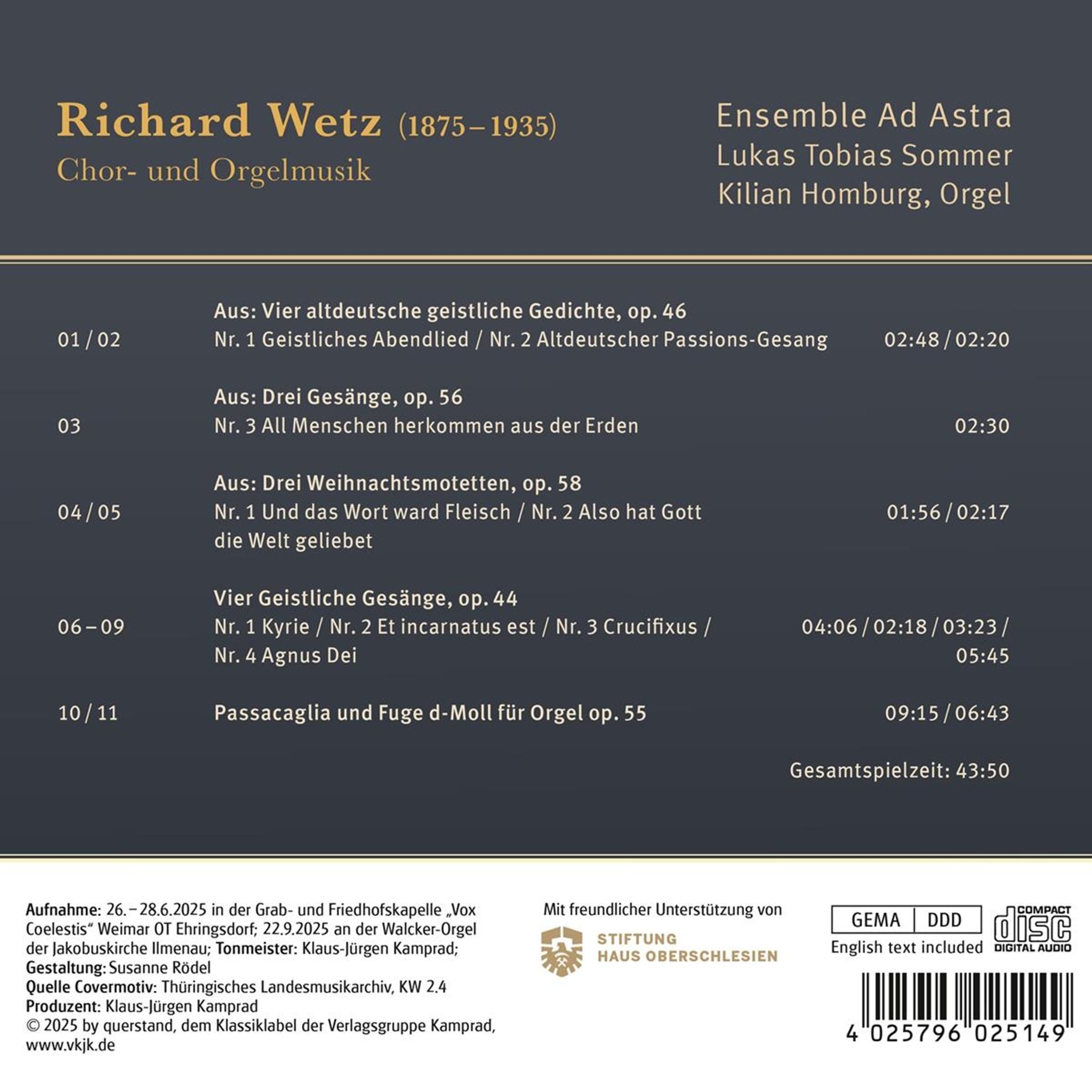 Mit seinem Lebensbogen schlägt der 1875 in Gleiwitz geborene Richard Wetz eine Brücke zwischen seiner schlesischen Heimat und seinen späteren Wirkungsorten, den thüringischen Städten Erfurt und Weimar. Diese regionale Brücke bricht der Komponist, Dirigent und Lehrer bis zu seinem Lebensende 1935 nicht ab. Unterschiedlichste Strömungen des frühen 20. Jahrhunderts sind ihm bekannt, spielen aber in seinen Kompositionen keine wesentliche Rolle. Sein Klangideal bewegt sich um seine großen Vorbilder Franz Liszt, Anton Bruckner und Richard Wagner. Typisch für seine Werke sind die erstaunliche kontrapunktische Dichte, weit gespannte thematische Phrasen und höchst kunstfertige harmonische Verästelungen. Die auf dieser CD erstmalig veröffentlichten Chorwerke stammen aus seiner späten Schaffensphase und sind auch im Zusammenhang mit den Erfahrungen als Chorleiter sowohl in Erfurt wie auch des überaus gut ausgebildeten Riedelschen Gesangsvereins in den Jahren 1913 / 14 in Leipzig zu sehen. Das junge Vokalensemble Ad Astra, das sich der Pflege selten zu hörender Chormusik verschrieben hat, legt unter seinem Gründer und Leiter Lukas Tobias Sommer hiermit seine erste Aufnahme vor. Die Passacaglia und Fuge d-Moll für Orgel op. 55 ist von einer einzigartigen Stellung im kompositorischen Wirken von Richard Wetz. Es wird das einzige große veröffentlichte Orgelwerk des Erfurters bleiben. Das Werk ist von einer beeindruckenden Polyphonie gekennzeichnet. Kilian Homburg spielt es an der 1911 erbauten Walcker-Orgel der Jakobuskirche Ilmenau, einer elsässischen Reformorgel symphonischer Prägung mit der größten Registerzahl in Thüringen.