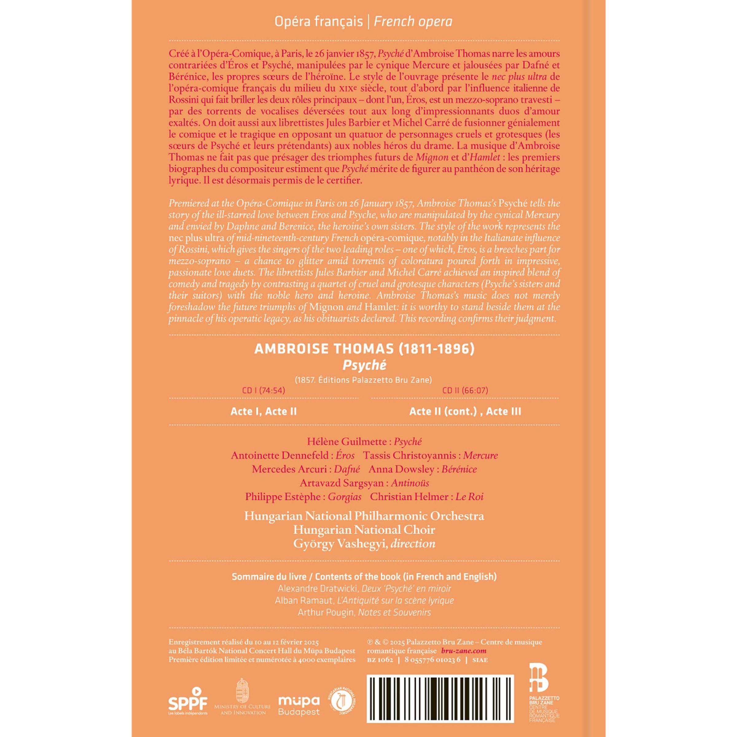Psyché von Ambroise Thomas wurde am 26. Januar 1857 an der Opéra-Comique in Paris uraufgeführt und erzählt die Geschichte der unglücklichen Liebe zwischen Eros und Psyche, die vom zynischen Merkur manipuliert und von Daphne und Berenice, den Schwestern der Heldin, beneidet werden. Der Stil des Werks repräsentiert das Nonplusultra der französischen Opéra-comique aus der Mitte des 19. Jahrhunderts, insbesondere durch den italienischen Einfluss Rossinis, der den Sängern der beiden Hauptrollen - eine davon, Eros, ist eine Hosenrolle für Mezzosopran - die Möglichkeit gibt, in einem Schwall von Koloraturen zu glänzen, die sich in beeindruckenden, leidenschaftlichen Liebesduetten ergießen. Den Librettisten Jules Barbier und Michel Carré gelang eine inspirierte Mischung aus Komödie und Tragödie, indem sie ein Quartett grausamer und grotesker Charaktere (Psyches Schwestern und ihre Freier) dem edlen Helden und der Heldin gegenüberstellten. Die Musik von Ambroise Thomas lässt nicht nur die zukünftigen Triumphe von Mignon und Hamlet erahnen: Sie ist würdig, neben ihnen an der Spitze seines opernhaften Erbes zu stehen, wie seine Nachrufer erklärten. Die vorliegende Aufnahme bestätigt ihr Urteil.