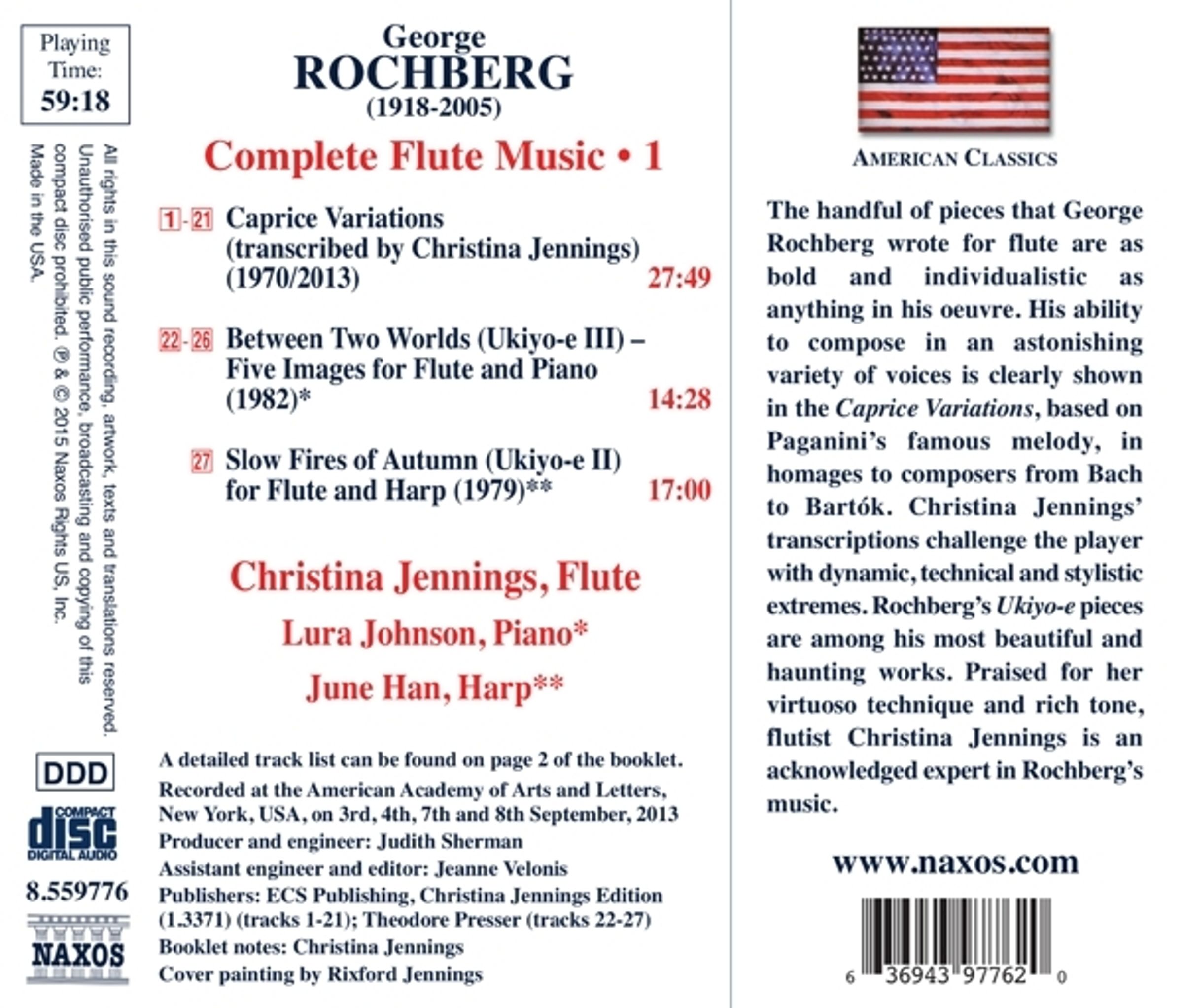 Die wenigen Stücke, die George Rochberg für Flöte geschrieben hat, sind so kühn und eigenwillig wie alles andere in seinem Oeuvre. Seine Fähigkeit, in einer erstaunlichen Stimmenvielfalt zu komponieren, zeigt sich deutlich in den Caprice-Variationen, die auf Paganinis berühmter Melodie basieren und eine Hommage an Komponisten von Bach bis Bartók darstellen.