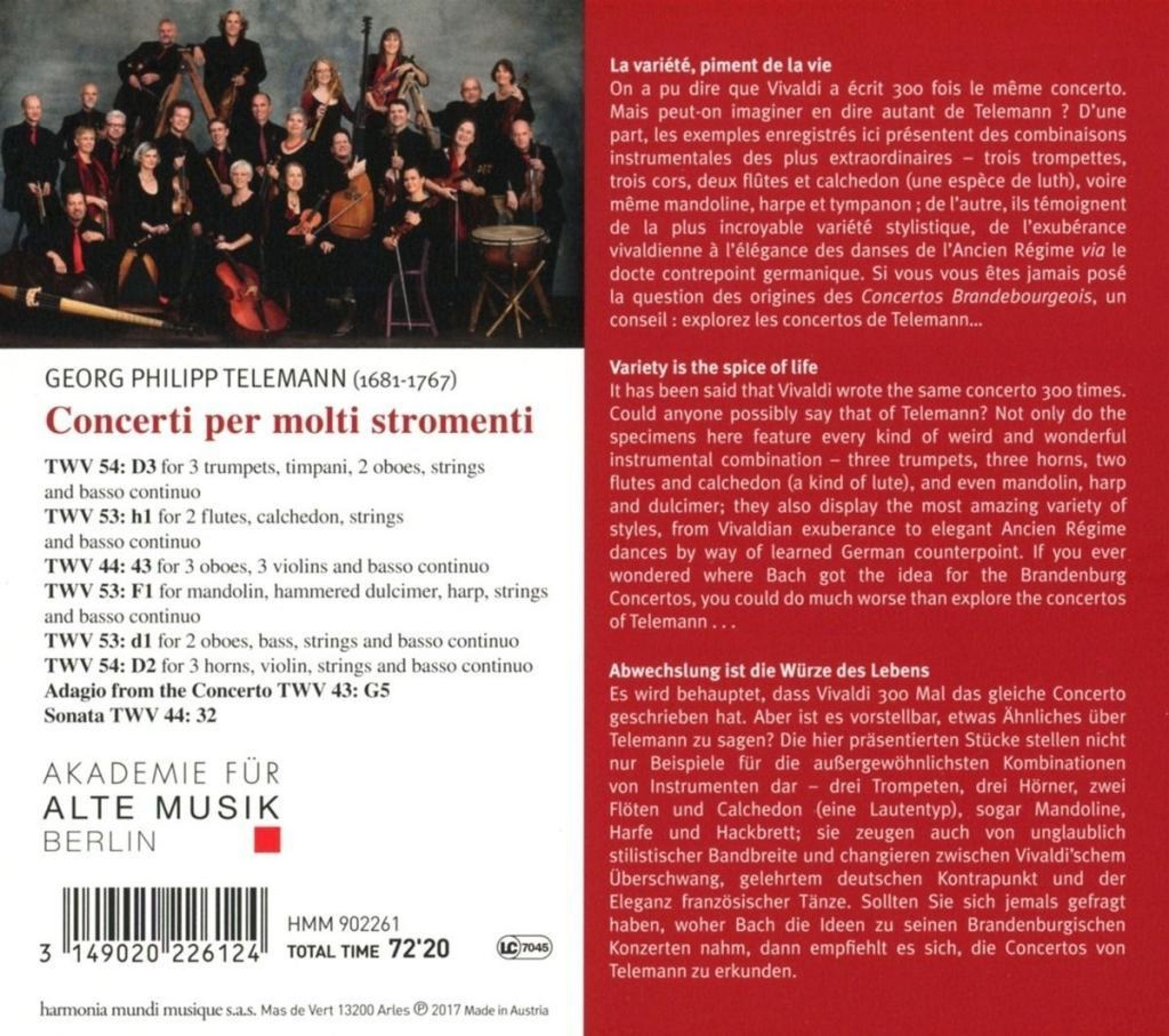 Es wird behauptet, dass Vivaldi 300 Mal das gleiche Concerto geschrieben hat. Aber ist es vorstellbar, etwas Ähnliches über Telemann zu sagen? Die hier präsentierten Stücke stellen nicht nur Beispiele für die außergewöhnlichsten Kombinationen von Instrumenten dar – drei Trompeten, drei Hörner, zwei Flöten und Calchedon (eine besondere Langhalslaute), sogar Mandoline, Harfe und Hackbrett; sie zeugen auch von unglaublicher stilistischer Bandbreite, die von Vivaldi’schem Überschwang bis hin zu der mit Hilfe des gelehrten deutschen Kontrapunktes geschaffenen Eleganz der Tänze des Ancien Régime reicht. Sollten Sie sich jemals gefragt haben, woher Bach die Ideen zu seinen Brandenburgischen Konzerten nahm, dann empfiehlt es sich, die Concertos von Telemann zu erkunden.