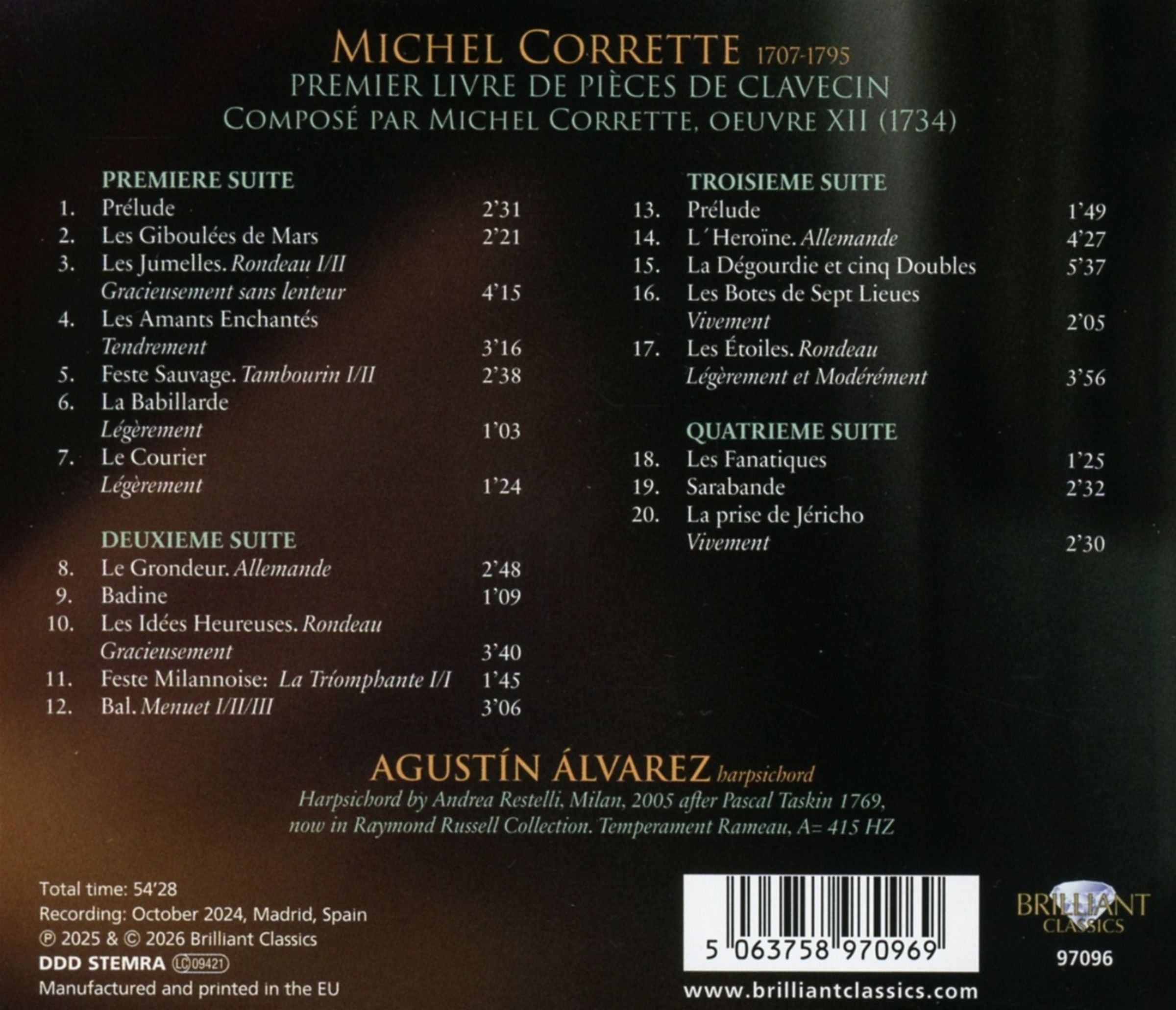 Michel Corrette (1707–1795) wurde in eine musikalische Familie hineingeboren, sein Vater war Organist, sein Großvater Tanzlehrer. Er war ein berühmter Komponist, Lehrer und Organist, dessen langes Leben den kulturellen Wandel vom Barock zur Klassik miterlebte. Das Album enthält Suiten mit Tänzen und Charakterstücken im französischen Stil, die dem von François Couperin und Jean-Philippe Rameau etablierten Modell folgen. Typische Sätze sind Allemanden, Courantes, Sarabanden und Gigue, daneben gibt es eher beschreibende Werke mit evokativen Titeln. Diese Stücke spiegeln die Vorliebe der Franzosen wider, Stimmungen, Persönlichkeiten oder sogar humorvolle Karikaturen durch Musik darzustellen. Gleichzeitig beweist Corrette ein Gespür für lebhafte Rhythmen und helle Texturen, die auf die italienische Energie anspielen, die in den 1730er Jahren in Paris in Mode war. Im Gegensatz zu Couperin, der nach Raffinesse und subtiler Eleganz strebte, bevorzugte Corrette oft einen direkteren und zugänglicheren Stil. Sein Premier livre war nicht nur für professionelle Musiker gedacht, sondern auch für geübte Amateure, was seiner lebenslangen Mission entsprach, Musik zugänglich zu machen.