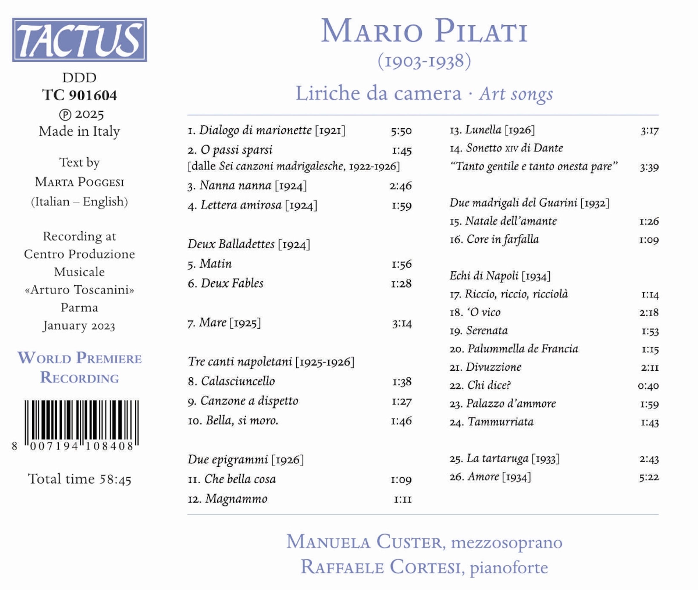 Karriere, sondern akzeptierte auch seine Verlobung mit Antonietta Margiotta nicht, die er 1928 heiratete und mit der er drei Töchter hatte. Die preisgekrönten Spezialistinnen Manuela Custer (Mezzosopran) und Raffaele Cortesi (Klavier) sind die Interpretinnen der Wiederentdeckung der vokalen Kammermusik eines wahrhaft brillanten neapolitanischen Komponisten.