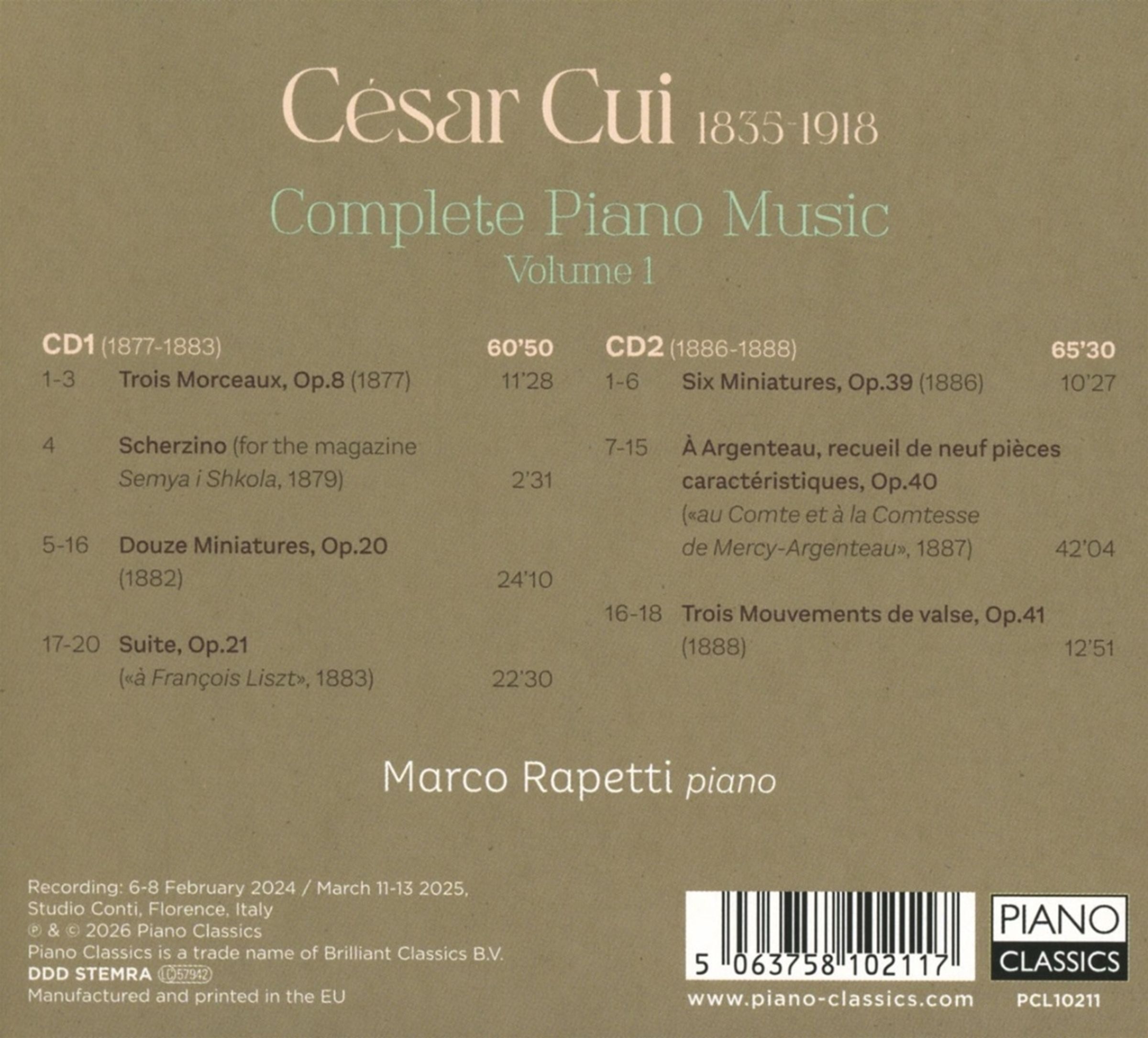 „Unwiederbringlich vergessen“ lautete das Urteil des Musikwissenschaftlers Richard Taruskin über die Musik von César Cui. In unserer Zeit würde man ihn als Dilettantenkomponisten abtun, da er ein Mann mit vielen Talenten war, der seine Karriere im russischen Militär machte, zunächst als Offizier und dann als Experte für Befestigungsanlagen. In dieser Funktion wurde Cui Professor in Moskau und schrieb gleichzeitig zahlreiche Werke über Musik: Er war als strenger Kritiker bekannt und spielte eine wichtige Rolle bei der Förderung einer neuen, unverwechselbaren russischen Musikschule, die auf den nationalistischen Opern von Glinka und Mussorgsky aufbaute. In diesem Zusammenhang steht Cuís eigene Musik im Widerspruch zu seiner Philosophie, da sie einen mitteleuropäischen poetischen Stil pflegt, der den Vorbildern Chopins und Schumanns verpflichtet ist. Marco Rapetti ist der erste Pianist, der sein gesamtes Klavierwerk aufgenommen hat, und dieser erste Band umfasst die Jahre 1877 bis 1888, von den Trois morceaux Op. 8 bis zu den Trois mouvements de valse Op. 41. Zu den reizvollen Miniaturen gehören Mazurkas und Serenaden, die trotz ihrer Kürze nicht weniger charmant sind. Die umfangreichsten der hier vorgestellten Sammlungen sind die Suite Op. 21, die Franz Liszt gewidmet ist, und eine Suite von neun „Pieces caractéristiques” Op. 40, die dem Grafen und der Gräfin de Mercy-Argenteau gewidmet ist; die Gräfin war eine unermüdliche Förderin von Cuis Musik in Westeuropa.