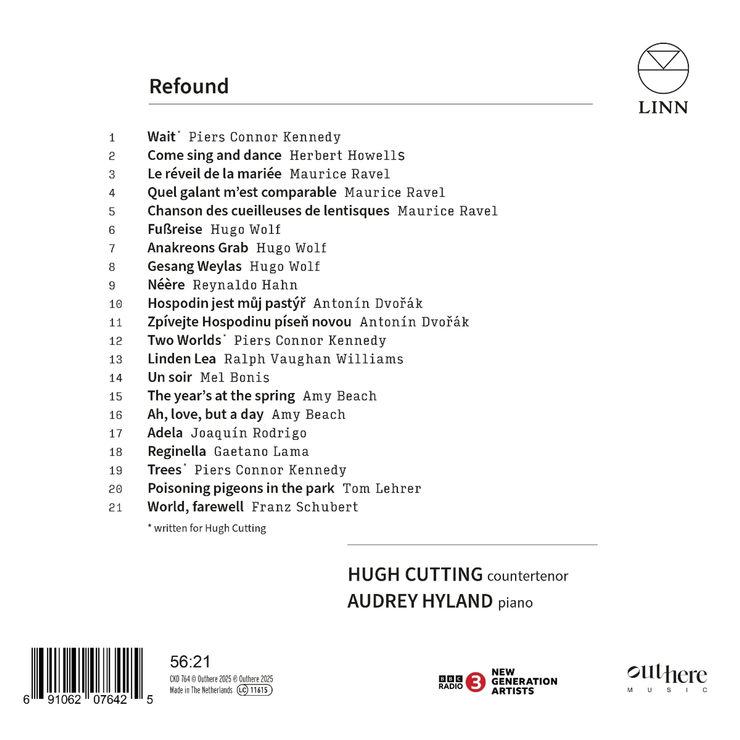 Mit seinem Rezital-Debüt "Refound" feiert der britische Countertenor Hugh Cutting gemeinsam mit der Pianistin Audrey Hyland die Wiederentdeckung und Neuinterpretation ganz besonderer Lieder. Das Programm nimmt Werke von 14 Komponisten in den Fokus, die in ihrer Konstruktion, ihrem Text oder ihrem Kontext Altes und Neues vereinen und ein Zeugnis der Schönheit von Interpretation und Wiederbelebung sind. Volksnahe Lieder von Ravel und Vaughan Williams, Lieder von Howells und Dvorak mit uralten Texten wechseln ab mit Stücken von Wolf und Hahn, die ferne, imaginierte Zeiten heraufbeschwören. Romantische Trennungen und ihre Folgen verarbeiteten Beach, Rodrigo und Lama. Ergänzt wird dieser Reigen durch die wunderbare Musik von Mel Bonis, eine Weltersteinspielung von Piers Connor Kennedy sowie Jeremy Sams' neue englische Übersetzung von Schuberts "Abschied von der Erde".