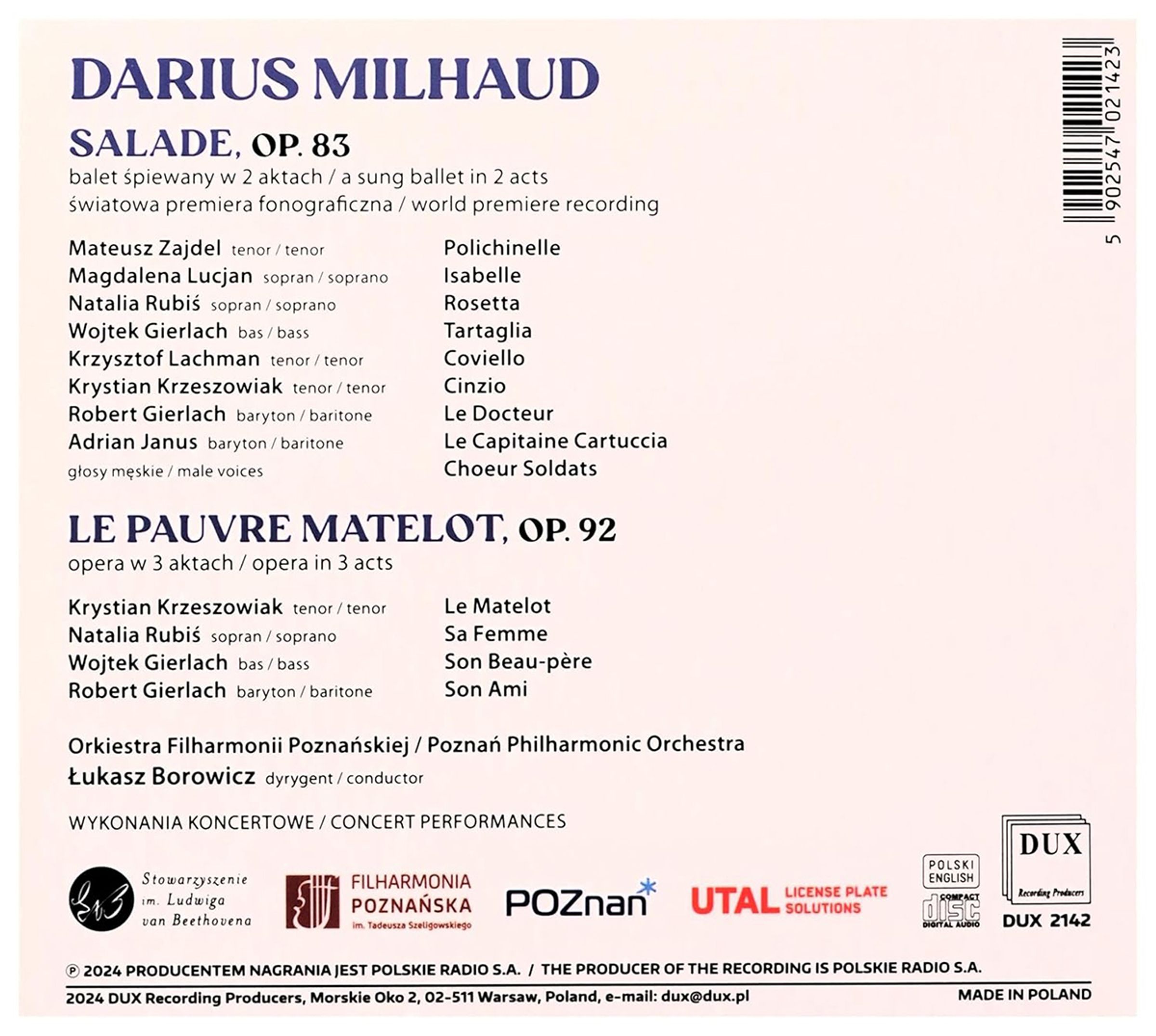 Diese Veröffentlichung des Philharmonischen Orchesters Posen enthält zwei Werke des französischen Komponisten Darius Milhaud. Darunter befindet sich die Weltpremiere-Aufnahme von Salade, op. 83, einem zweistufigen Gesangsballett, das Melodie mit rhythmischer Kreativität verbindet. Ebenfalls enthalten ist die dreiteilige Oper Le Pauvre Matelot, op. 92, eine Geschichte über Rückkehr und tragische Missverständnisse. Diese Live-Aufnahmen bieten eine neue Perspektive auf Milhauds Beiträge zur Bühnenmusik des 20. Jahrhunderts.