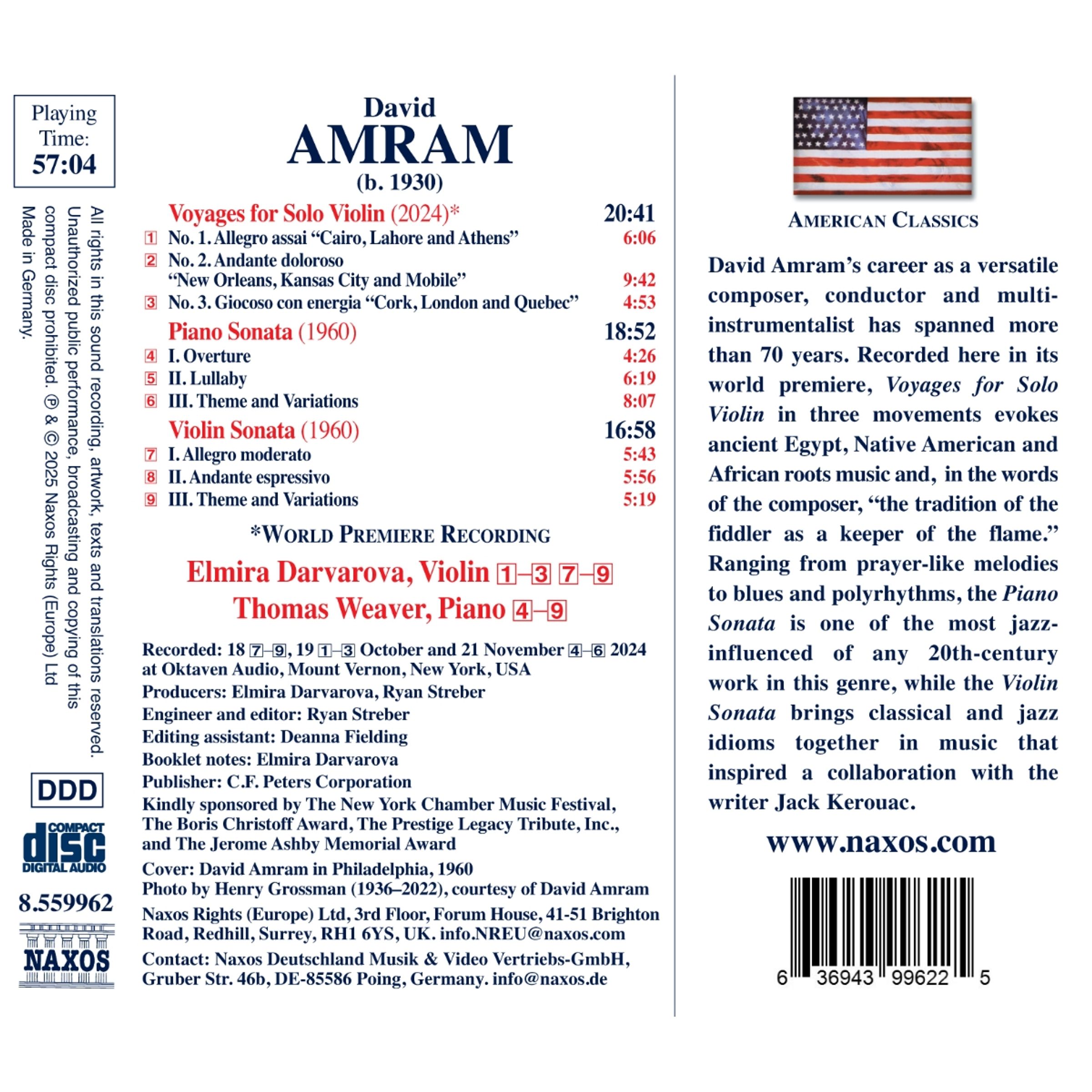 David Amrams Karriere als vielseitiger Komponist, Dirigent und Multiinstrumentalist erstreckt sich über mehr als 70 Jahre. Das hier in seiner Weltpremiere aufgezeichnete Werk Voyages für Solovioline in drei Sätzen erinnert an das alte Ägypten, die Musik der amerikanischen Ureinwohner und die afrikanische Roots-Musik und, in den Worten des Komponisten, an „die Tradition des Fiddlers als Hüter der Flamme“. Die Klaviersonate, die von gebetsartigen Melodien über Blues bis hin zu Polyrhythmen reicht, ist eines der am stärksten vom Jazz beeinflussten Werke des 20. Jahrhunderts in diesem Genre, während die Violinsonate klassische und jazzige Ausdrucksformen in einer Musik vereint, die eine Zusammenarbeit mit dem Schriftsteller Jack Kerouac inspirierte.