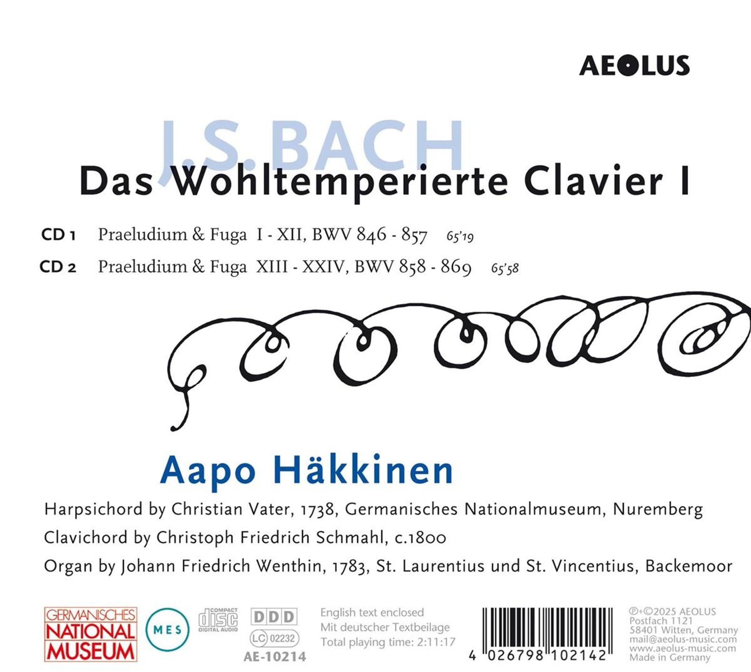 Der finnische Cembalist Aapo Häkkinen spielt Bachs Wohltemperiertes Clavier Band 1 auf dem in Nürnberg befindlichen Christian-Vater-Cembalo und einem ebenfalls historischen Clavichord. Zwei der 24 Paare aus Praeludium und Fuge werden zusätzlich in alternativer Instrumentierung an der historischen norddeutschen Orgel von Backemoor präsentiert. Aapo Häkkinen hat sich nicht zuletzt durch seine Einspielungen der Bach’schen Cembalokonzerte bei AEOLUS international einen Namen gemacht.