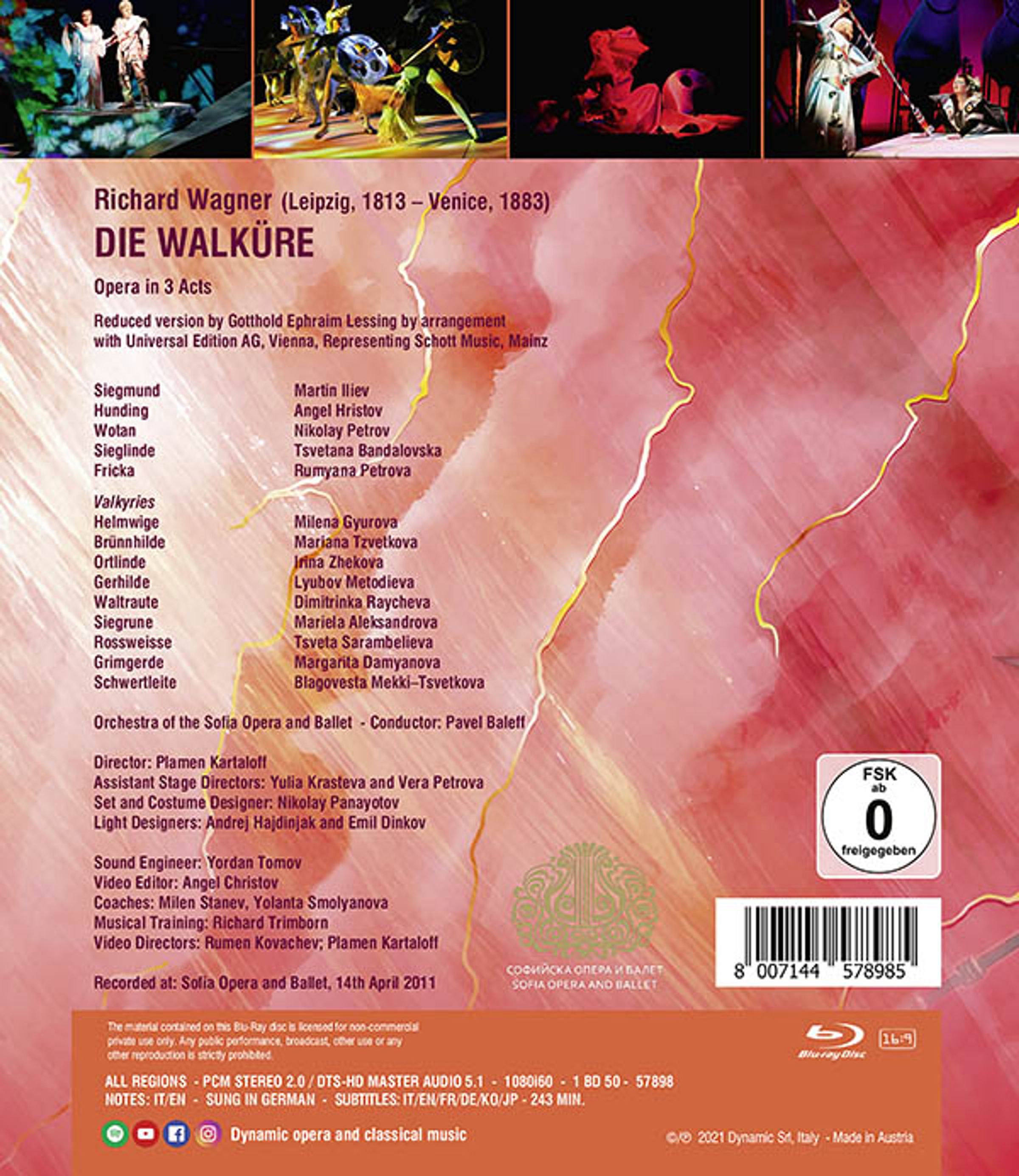 Die Walküre ist der zweite Teil von Der Ring des Nibelungen und bis heute die beliebteste der Opern-Tetralogie. Herausragend sind die Liebenden Siegmund und Sieglinde, die sich den Zorn der Ehegöttin Fricka zuziehen und deren langes Duett im großartig getragenen ersten Akt zu den Glanzstücken des Werkes gehört. Der spektakuläre Walkürenritt, die bezaubernde Musik von Wotans Abschied und das magische Feuer, mit dem die Oper endet, sind weitere Höhepunkte dieser von der Kritik gefeierten Produktion der Nationaloper Sofia.