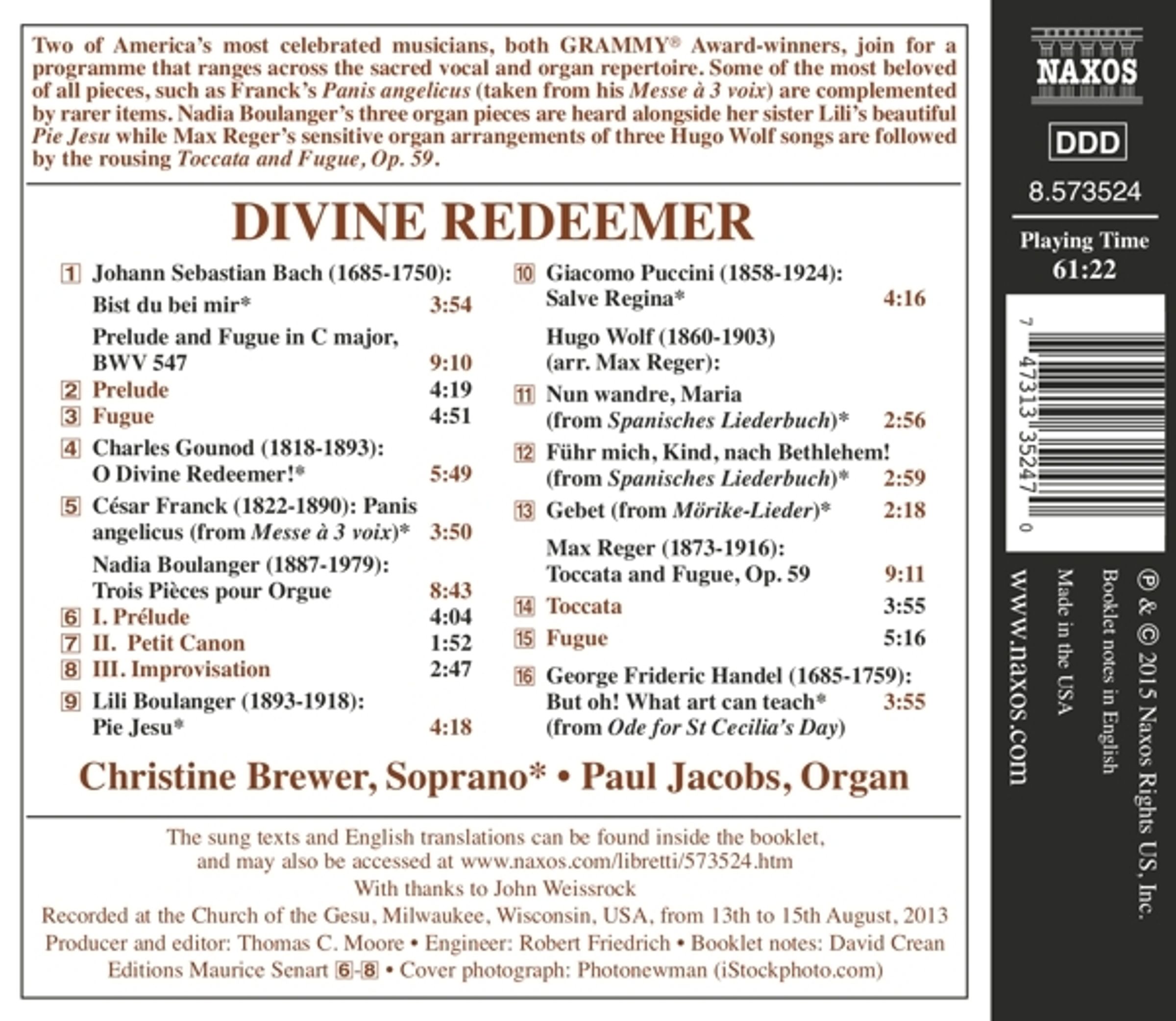 Nadia Boulangers drei Orgelstücke erklingen neben dem wunderschönen Pie Jesu ihrer Schwester Lili, während Max Regers einfühlsame Orgelbearbeitungen von drei Liedern von Hugo Wolf von der mitreißenden Toccata und Fuge op. 59 gefolgt werden.