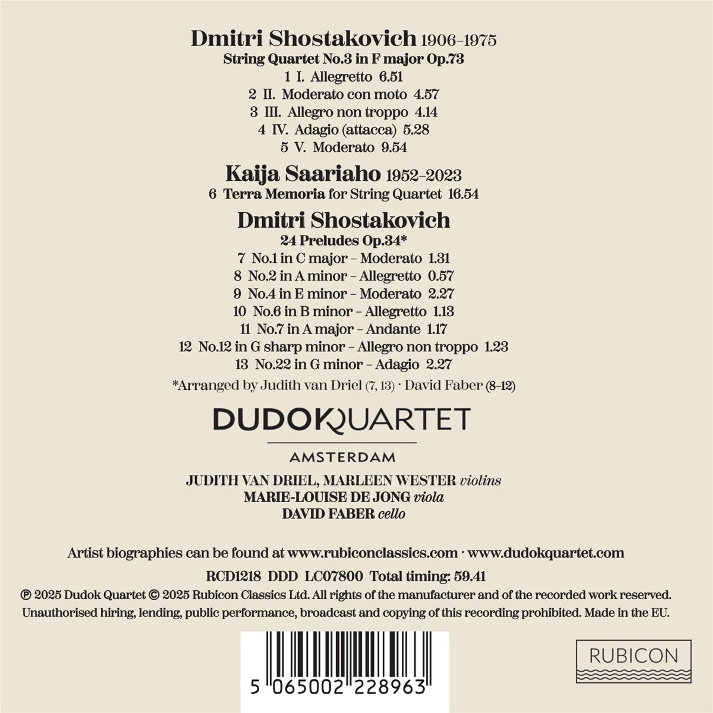 Auf diesem sechsten Album für Rubicon Classics kombiniert das Dudok Kwartet Schostakowitschs Drittes Streichquartett (1946) mit Kaija Saariahos Zweitem Streichquartett Terra Memoria (2007). Wie auf Reflections (2022) entsteht ein neues Spiegelspiel zwischen zwei Komponisten, ergänzt durch Bearbeitungen von Schostakowitschs Präludien op. 34.
