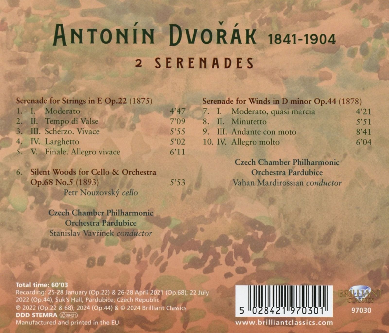 Antonín Dvořák (1841-1904) komponierte zwei bezaubernde Serenaden, die das Publikum mit ihrer melodischen Schönheit und ihrem atmosphärischen Charme in den Bann ziehen. Diese Kompositionen, die Serenade für Streicher E-Dur op. 22 und die Serenade d-Moll für Blasinstrumente, Violoncello und Kontrabass op. 44, spiegeln Dvořáks großes Geschick, traditionelle Elemente der klassischen Musik mit den reichen Volksmelodien seiner böhmischen Heimat zu verbinden. Die Serenade für Streicher, komponiert 1875, ist ein reizvolles Werk in fünf Sätzen. Sie wird oft als Dvořáks „Liebesbrief“ an die Streichinstrumente bezeichnet. Das Stück verströmt sanften, lyrischen Charakter und zeigt Dvořáks melodisches Können und seine geschickte Orchestrierung. Das Werk zeichnet sich durch seine warmen, schwebenden Melodien und das lebendige Wechselspiel der Streicher aus, die es zu einem der beliebtesten Werke des Repertoires für Streichorchester machen. Die Serenade für Blasinstrumente von 1878 ist hingegen eine lebhafte und temperamentvolle Komposition für Bläserensemble aus Oboen, Klarinetten, Fagotten und Hörnern. Diese Serenade spiegelt Dvořáks Erkundung des Mediums Bläserensemble und bietet eine reiche Palette an Klangfarben und Texturen. In den Ecksätzen hat sie überschwängliche, tänzerische Qualität, während die dazwischen liegenden Sätze Momente der Introspektion und lyrischen Schönheit bieten. Die Tschechische Kammerphilharmonie Pardubice unter der Leitung von Vahan Mardirossian und Stanislav Vavřínek spielt mit viel Hingabe und Einfühlungsvermögen für das Idiom. Als Bonustrack ist Waldesruh für Violoncello und Orchester enthalten, Solist ist Petr Nouzovský.