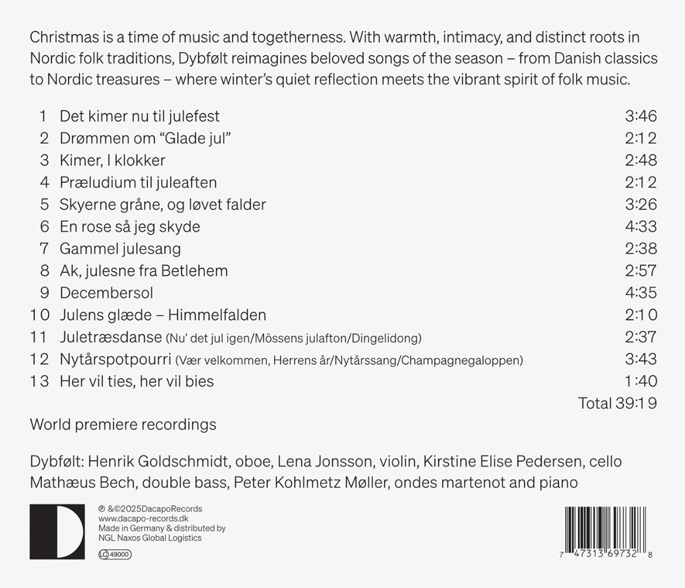 Mit Wärme, Ausstrahlung und tief verwurzelt in nordischen Volkstraditionen wirft "Decembersol" ein neues Licht auf klassische dänische Weihnachtslieder. Das Ensemble Dybfolthas hat sich intensiv mit dem Weihnachtsmusikrepertoire Dänemarks und Schwedens auseinandergesetzt und eine Auswahl sowohl beliebter Weihnachtsklassiker als auch selten zu hörender Perlen skandinavischer Komponisten zusammengestellt, die mit einem festlichen Neujahrs-Potpourri enden. Eine Sammlung atmosphärischer Interpretationen, in denen die stille Besinnlichkeit von Weihnachten auf die lebensbejahende Energie der Volksmusik trifft. Das Singen ist ein wesentlicher Bestandteil der dänischen Weihnachtstradition, sowohl in der Kirche als auch zu Hause, wo Familien um den Weihnachtsbaum herum singen und tanzen. Das Ensemble präsentiert frische und originelle Interpretationen der Melodien, und stützt sich dabei auf seinen nordischen Musikhintergrund, bezieht aber ebenso Elemente aus der Musik des Nahen Ostens ein, sowie Klezmer, sakrale Musik und klassische westliche Musik. Das Album enthält Lieder berühmter dänischer Komponisten wie Carl Nielsen, Per Nörgard und Rued Langgaard sowie eine Interpretation von "Det ar en ros utsprungen" (Es ist ein Ros entsprungen) in dem ikonischen Chorarrangement des schwedischen Komponisten Jan Sandström fur 12 Stimmen, hier gesungen von ondes martenot.