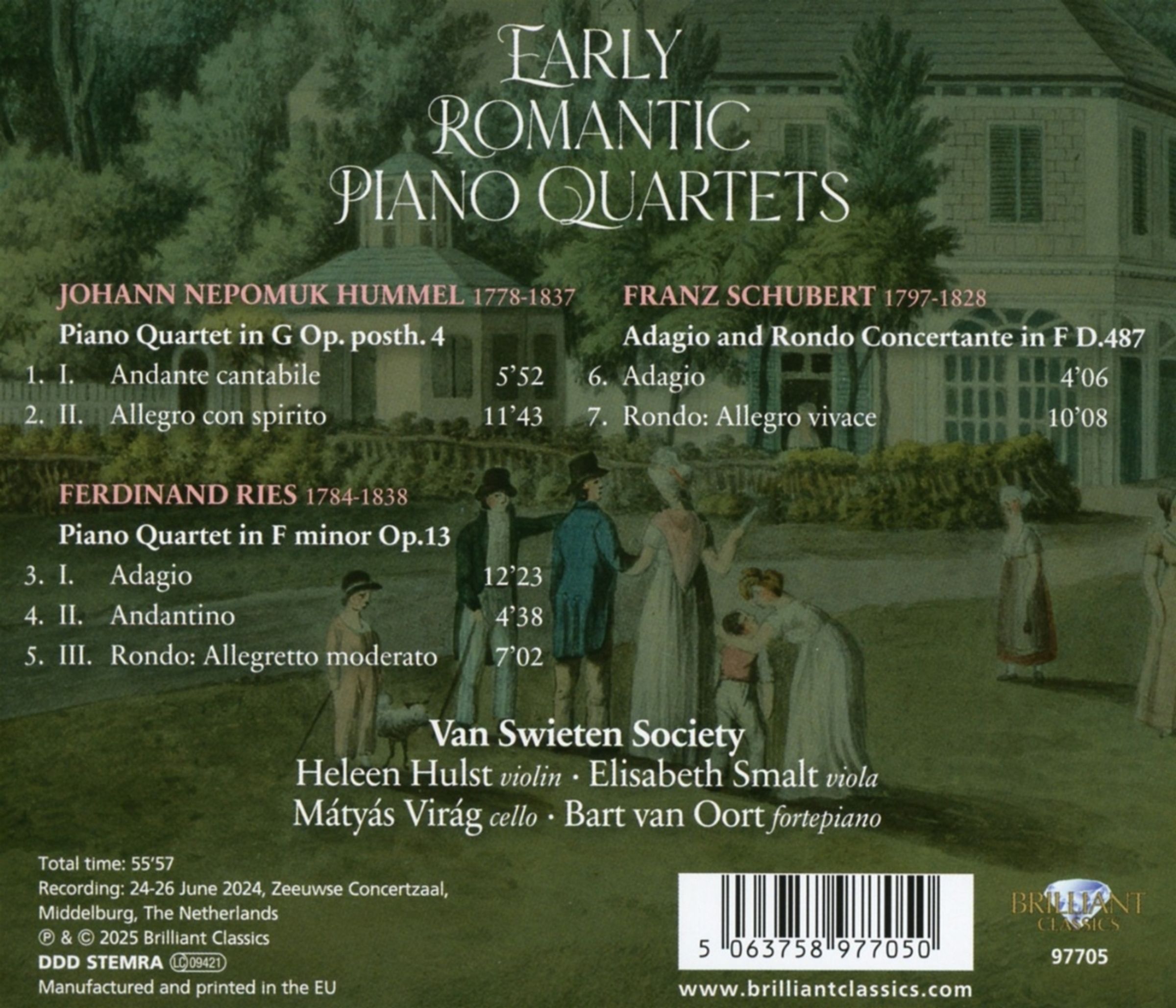 Die Romantik hatte viele Gesichter. Mozarts Geist war noch immer im Musikleben spürbar, und Beethovens kraftvolle Musik setzte Maßstäbe für jeden romantischen Komponisten. Mozarts Erbe wurde von zwei großen Pianisten fortgeführt: Hummel, einem Schüler Mozarts, und Ries, einem Schüler Beethovens. Jeder von ihnen lenkte die Romantik in eine andere Richtung. Zeitungen in ganz Europa schrieben von der »wilden Romantik« des Bohemiens Ries, der heute als Vorläufer Schumanns gilt. Derweil verzauberte und verblüffte der Virtuose Hummel sein Publikum. Um 1815, zur Zeit des Wiener Kongresses, war er der berühmteste Pianist der Welt, und Liszt war verrückt nach seiner Musik. Schubert hingegen war der Schöpfer und die Verkörperung persönlicher Ausdruckskraft in der Romantik. Er trat nur in privaten Kreisen auf und hatte kein Interesse an leerer Virtuosität, obwohl er ein hervorragender Pianist war, dessen Instrument laut Zeitgenossen unter seinen Händen sang. Diese neue Aufnahme präsentiert das Klavierquartett G-Dur von Johann Nepomuk Hummel (1778-1837), das Klavierquartett f-Moll von Ferdinand Ries (1784-1838) und das Adagio & Rondo Concertante von Franz Schubert (1797-1828). Aufgeführt auf einem historischen Instrument der Van Swieten Society, mit Heleen Hulst (Violine), Elisabeth Smalt (Viola), Mátyás Virág (Cello) und Bart van Oort (Hammerklavier).