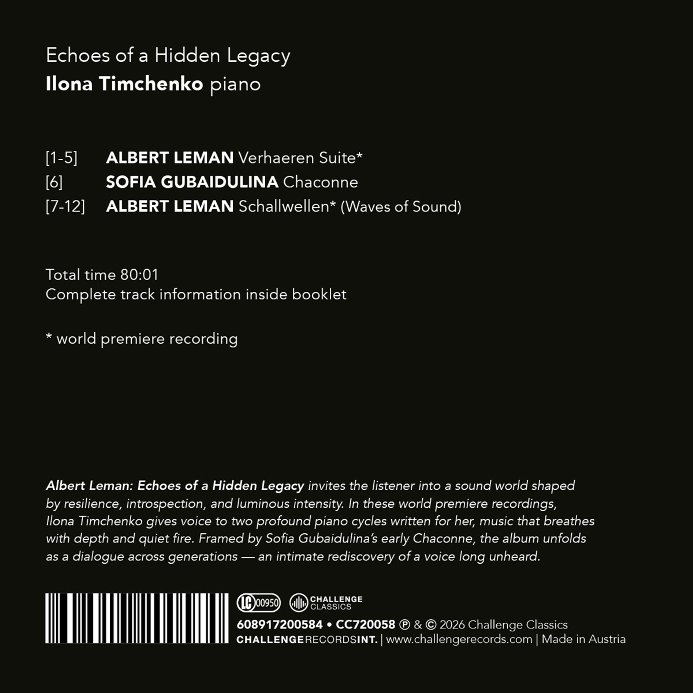 "Contains World Premiere Recordings. Albert Leman, Sofia Gubaidulina, Echoes of a Hidden Legacy, Ilona Timchenko piano." Frau in glitzerndem Kleid., CD