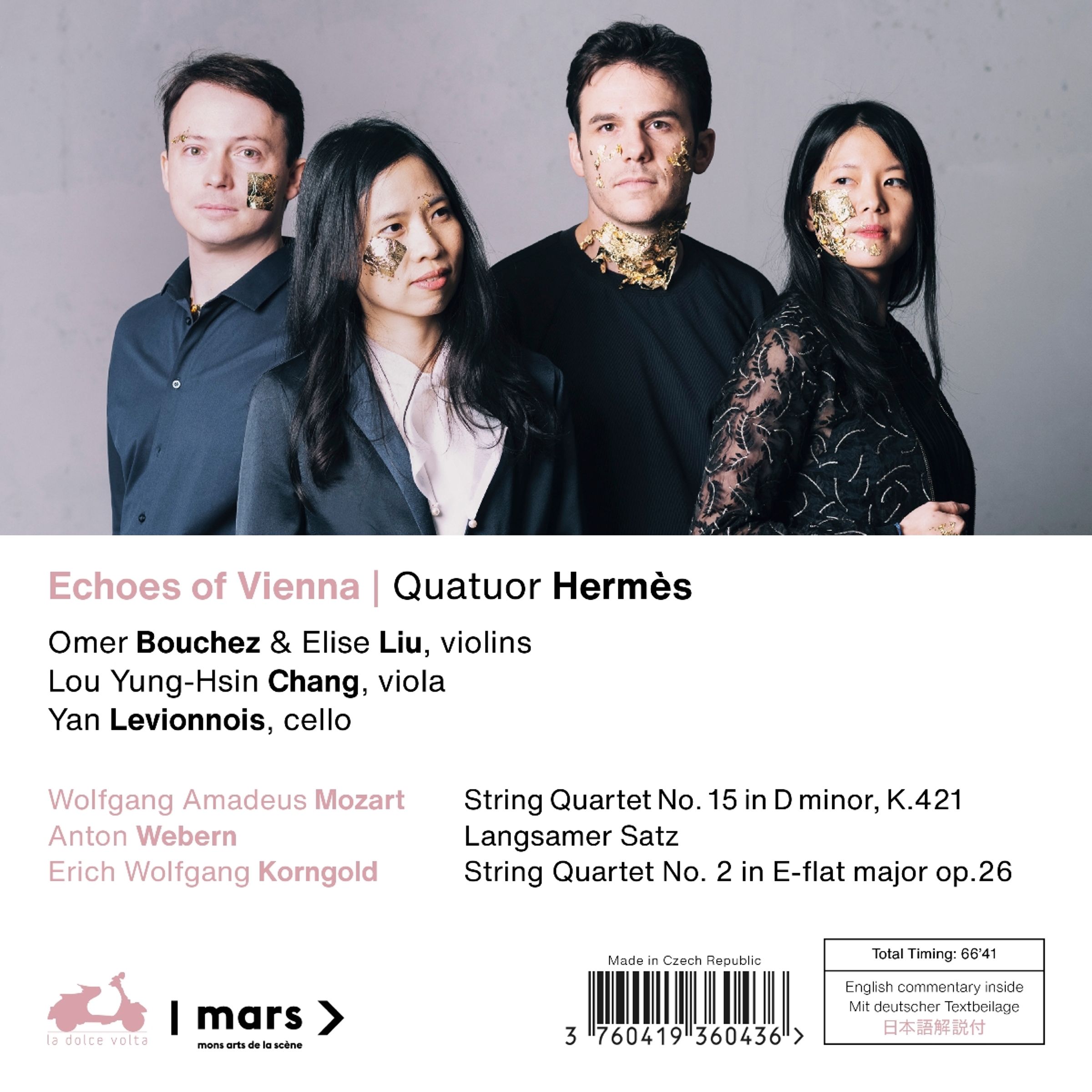 Texte: MOZART WEBERN KORNGOLD QUATUOR HERMÈS ECHOES OF VIENNA. Drei Menschen, goldene Partikel auf Glas., CD