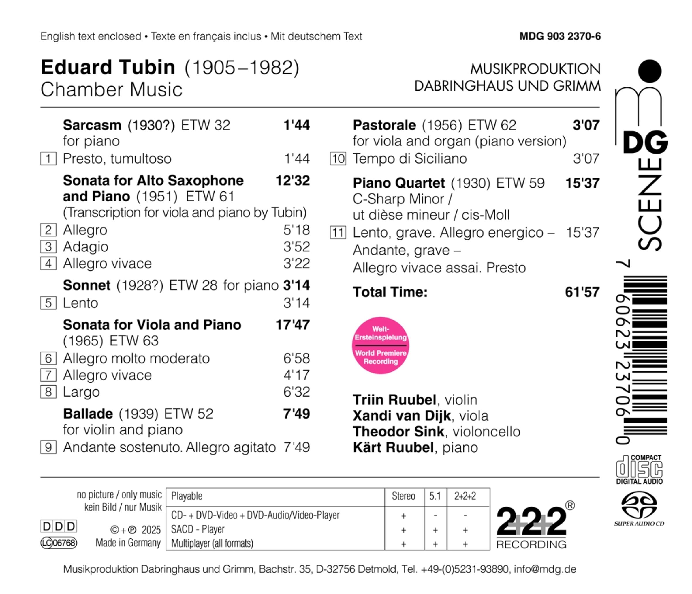 - Triin Ruubel (Violine), Xandi van Dijk (Viola), Theodor Sink (Cello), Kärt Ruubel (Klavier)