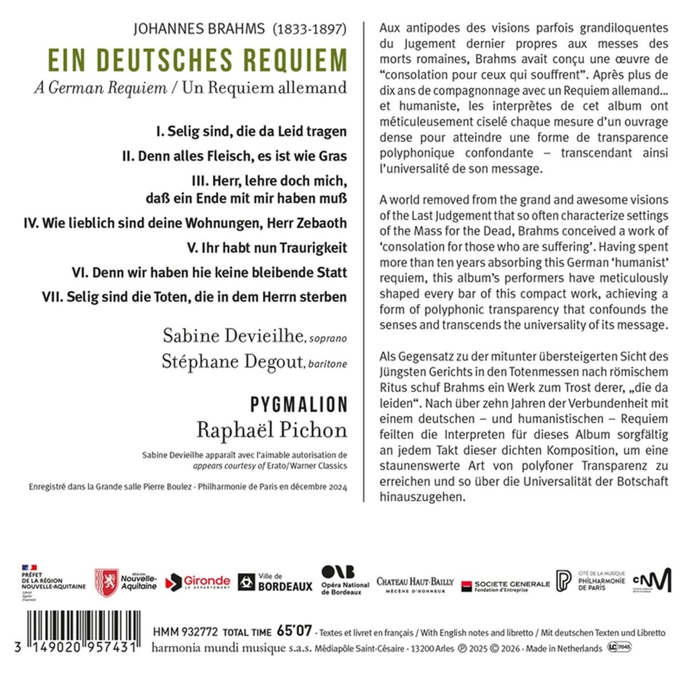 Als Gegensatz zu der mitunter übersteigerten Sicht des Jüngsten Gerichts in den Totenmessen nach römischem Ritus schuf Brahms ein Werk zum Trost derer, „die da leiden“. Nach über zehn Jahren der Verbundenheit mit einem deutschen – und humanistischen – Requiem feilten die Interpreten für dieses Album sorgfältig an jedem Takt dieser dichten Komposition, um eine staunenswerte Art von polyfoner Transparenz zu erreichen und so über die Universalität der Botschaft hinauszugehen.
