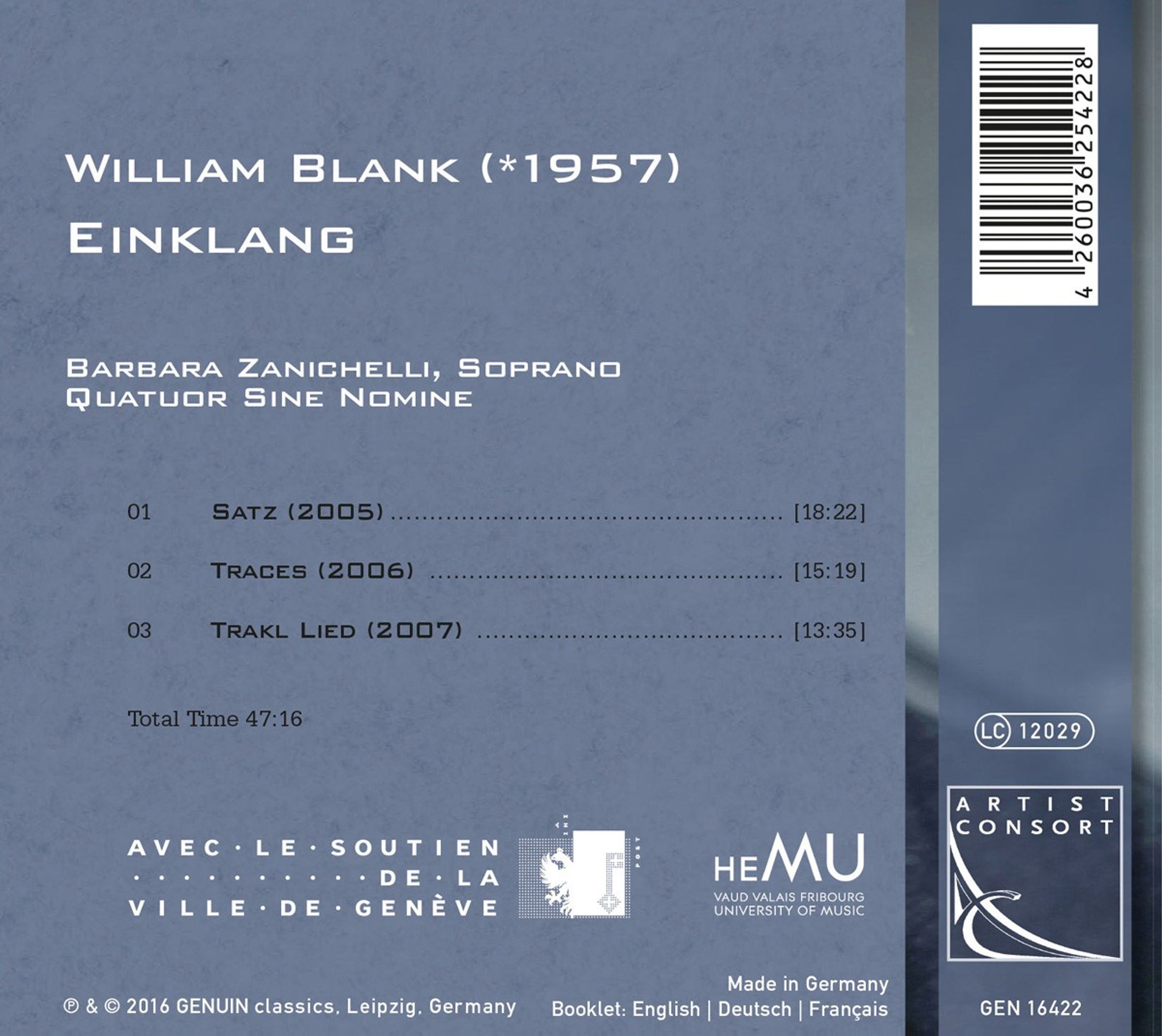 Wie gewaltig kann ein Streichquartett klingen! Das hört man auf der neuen GENUIN-CD (Reihe Artist Consort) des renommierten Quatuor Sine Nomine: Die Schweizer Musiker legen mit der Weltersteinspielung von William Blanks (*1957) „Buch für Streichquartett: Einklang“ einen echten Wurf hin. Zwischen enggeführten, sich reibenden Feldern und massiven Klangblöcken, zwischen klaren Akkorden und geräuschhaften Knoten bewegen sich die Welten des Schweizer Komponisten. Am Ende, im Zusammenspiel des fabelhaften Streichquartetts und der traumwandelnden Stimme von Barbara Zanichelli: Schwebendes Verlöschen der Musik auf Worte Georg Trakls