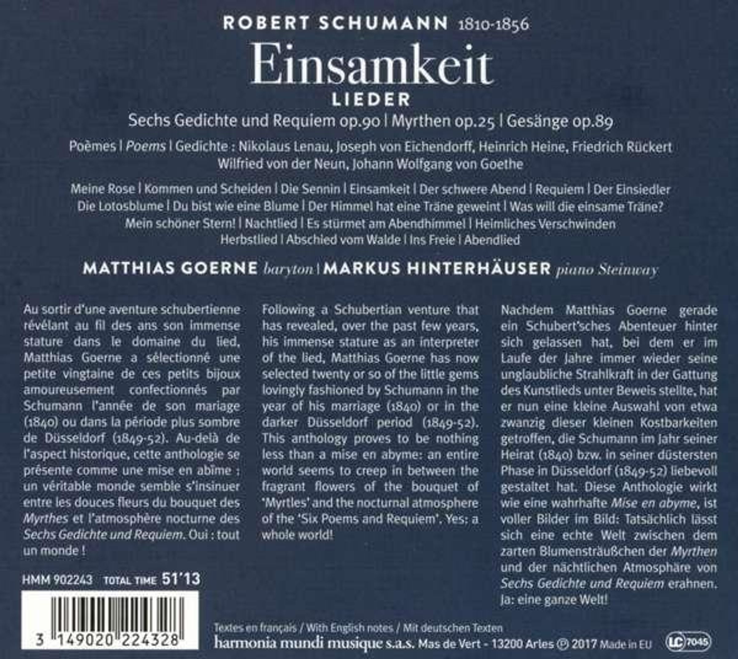 Nach seinem Schubert-Unternehmen, mit dem er auf zwölf CDs, begleitet von verschiedenen Pianisten, noch einmal eindrucksvoll seine immense Ausdruckskraft als einer der wichtigsten Lied-Interpreten unserer Zeit unter Beweis gestellt hat, wendet sich Matthias Goerne nun Robert Schumann zu. Die Auswahl reicht von der glücklichen Zeit in der Leipzig nach der Heirat mit Clara (1840) bis zu trüberen Tagen in Düsseldorf (1849–1852). In 20 Liedern tut sich zwischen dem duftenden Blumenbouquet der Myrthen op. 25 und der Nocturnegleichen Atmosphäre in Sechs Gedichte (Lenau) und Requiem (Dreves), op. 90 eine ganze Welt auf.
