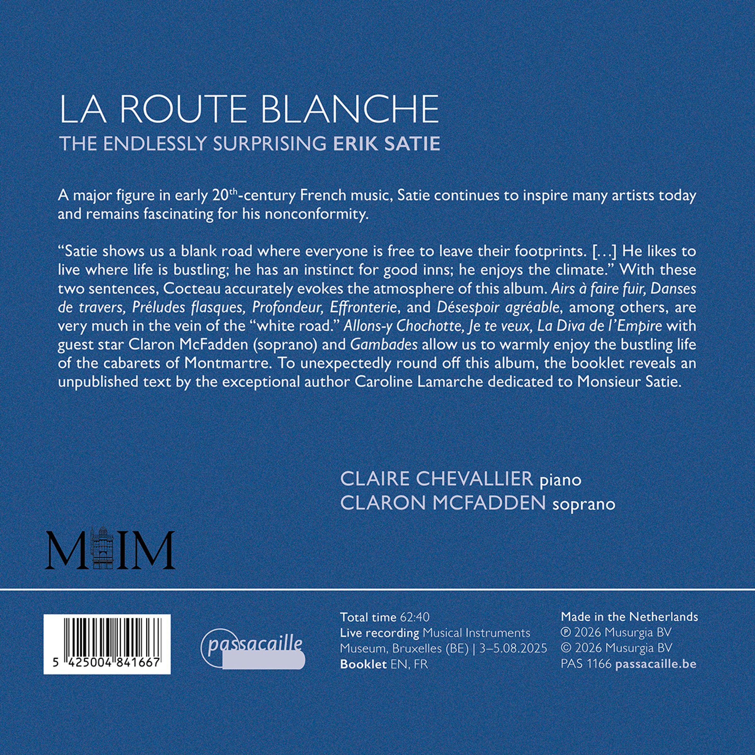 Als unerwarteten Abschluss dieses Albums enthüllt das Booklet einen unveröffentlichten Text der außergewöhnlichen Autorin Caroline Lamarche, der Monsieur Satie gewidmet ist.