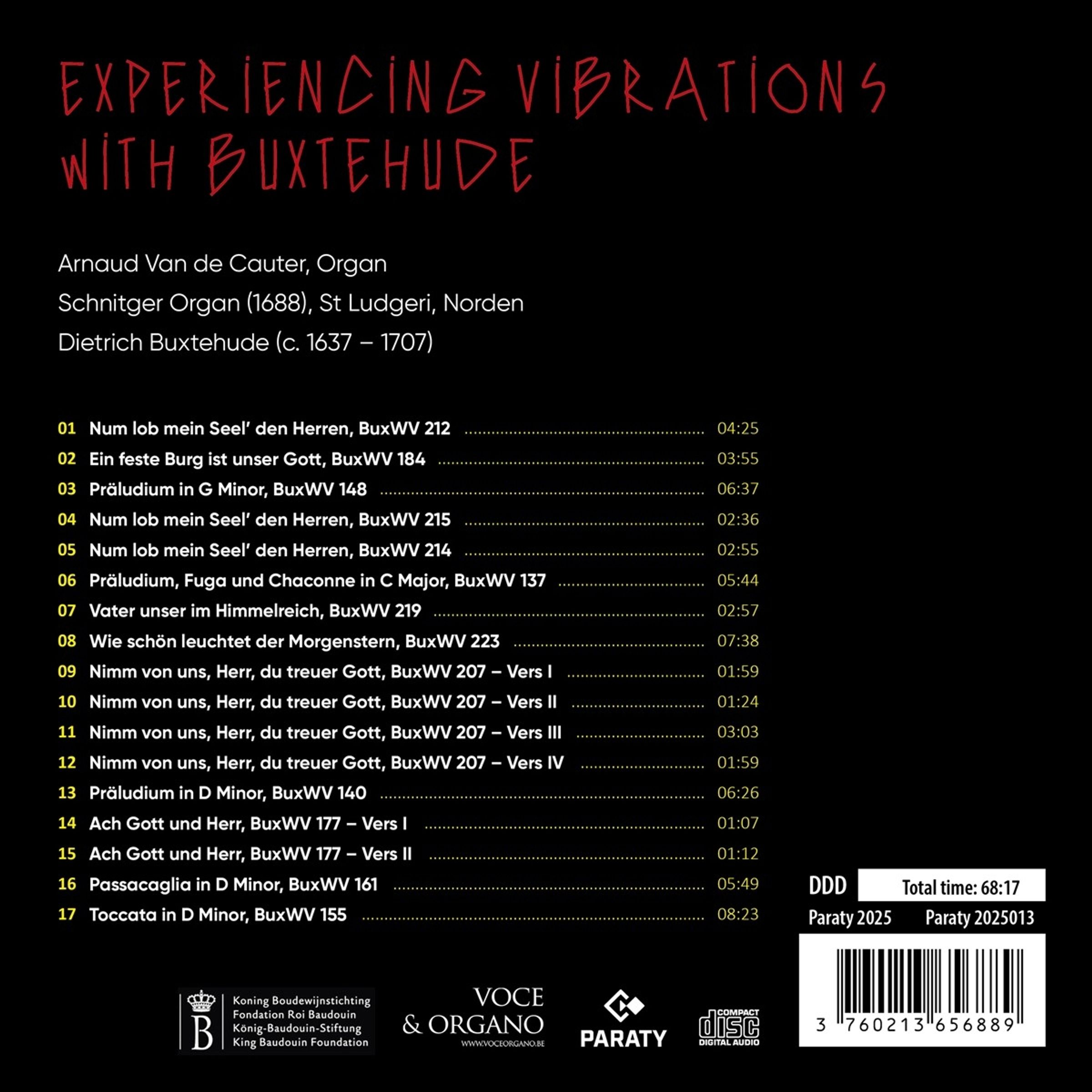 Buxtehudes Präludien, Choräle und Toccaten auf einer unglaublichen Orgel! Experiencing Vibrations with Buxtehude" ist das dritte Album des Organisten Arnaud Van de Cauter für das Label Paraty. Dieterich Buxtehude (1637-1707), eine wichtige Figur der norddeutschen Orgelschule und Inspirationsquelle für J. S. Bach, entfaltet in seinen Präludien, Chorälen und Toccaten eine Sprache, die reich an Kontrasten, Affekten und musikalischer Rhetorik ist. Die monumentale Orgel der St. Ludgeri-Kirche in Norden, ein Meisterwerk des Orgelbauers Arp Schnitger aus dem Jahr 1688, bietet einen idealen Rahmen für diese Musik: Ihre 46 Register, die auf mehrere Klangebenen verteilt sind, und ihre modifizierte mesotonische Temperierung offenbaren die ganze Farbe, die polyphone Klarheit und die Ausdruckskraft von Buxtehudes Komposition.