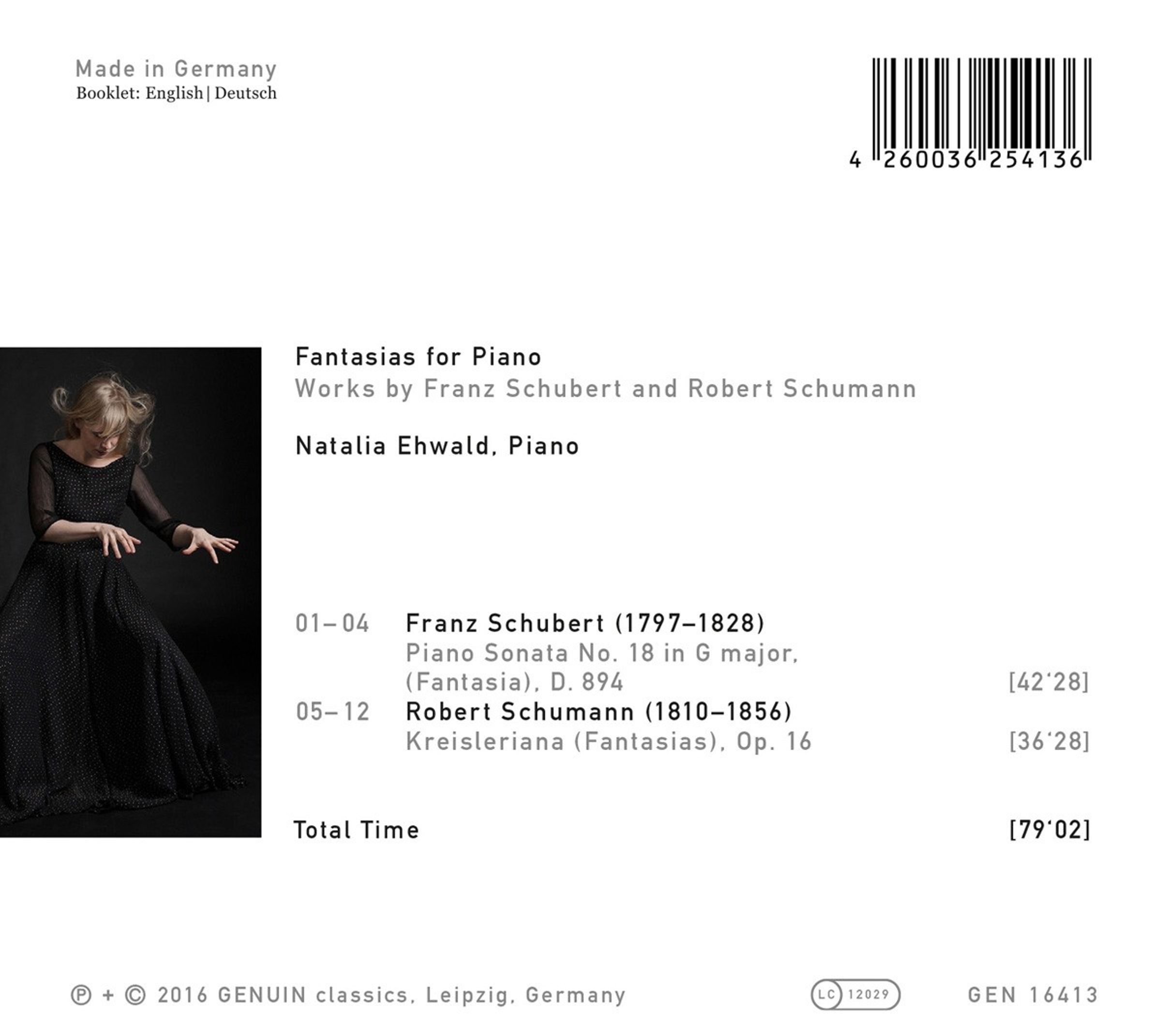 Die Preisträgerin des Robert-Schumann-Wettbewerbs 2000 in Zwickau legt hier eine Aufnahme großer Einheitlichkeit vor, welche die Expressivität der beiden Stücke herausarbeitet, aber auch die stillen Momente voller Innerlichkeit. Dabei hat sich Natalia Ehwald mit Schuberts G-Dur-Sonate D 894 und Schumanns »Kreisleriana« Op. 16 für ihre Einspielung zwei vermeintlich gegensätzliche Werke ausgesucht.