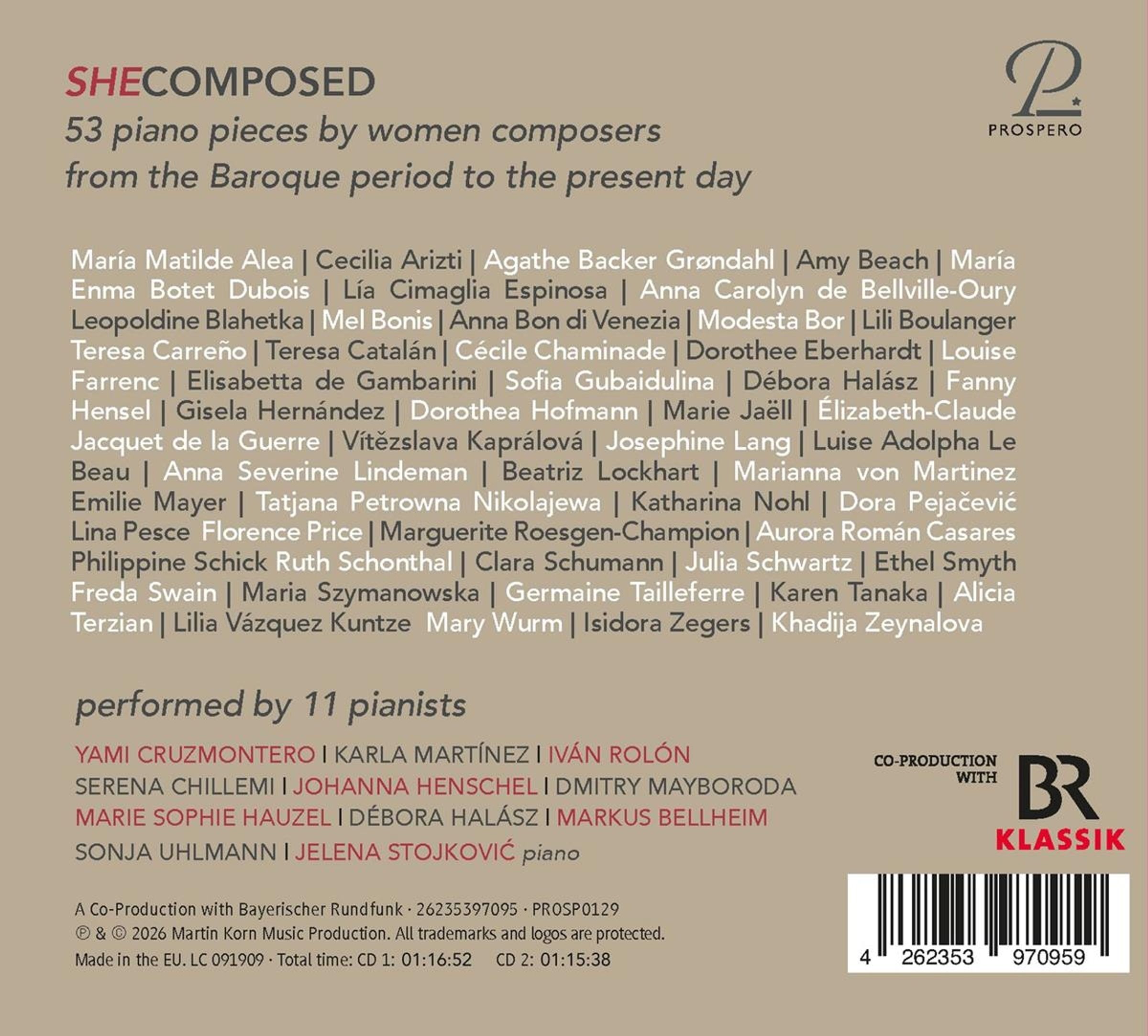 Mit der vorliegenden Doppel-CD She Composed – Musik von Komponistinnen liegt ein ebenso musikalisch wie kulturpolitisch bedeutsames Projekt vor, das künstlerische Qualität, pädagogisches Konzept und editorische Sorgfalt auf beispielhafte Weise verbindet. Die Einspielung präsentiert Klavierwerke von Komponistinnen aus mehreren Jahrhunderten und Kulturkreisen, bewusst geordnet nach ansteigendem Schwierigkeitsgrad – von kurzen, charaktervollen Miniaturen bis hin zu großformatigen, technisch und musikalisch anspruchsvollen Werken. Das besondere Konzept der CD liegt nicht nur in der stilistischen Vielfalt, sondern in der didaktisch durchdachten Dramaturgie: Die Stücke sind so ausgewählt, dass sie Pianistinnen und Pianisten vom frühen Unterrichtsstadium bis hin zum konzertreifen Niveau begleiten können. So entsteht ein klingender Entwicklungsweg, der technische Fortschritte ebenso hörbar macht wie wachsende Ausdruckstiefe.