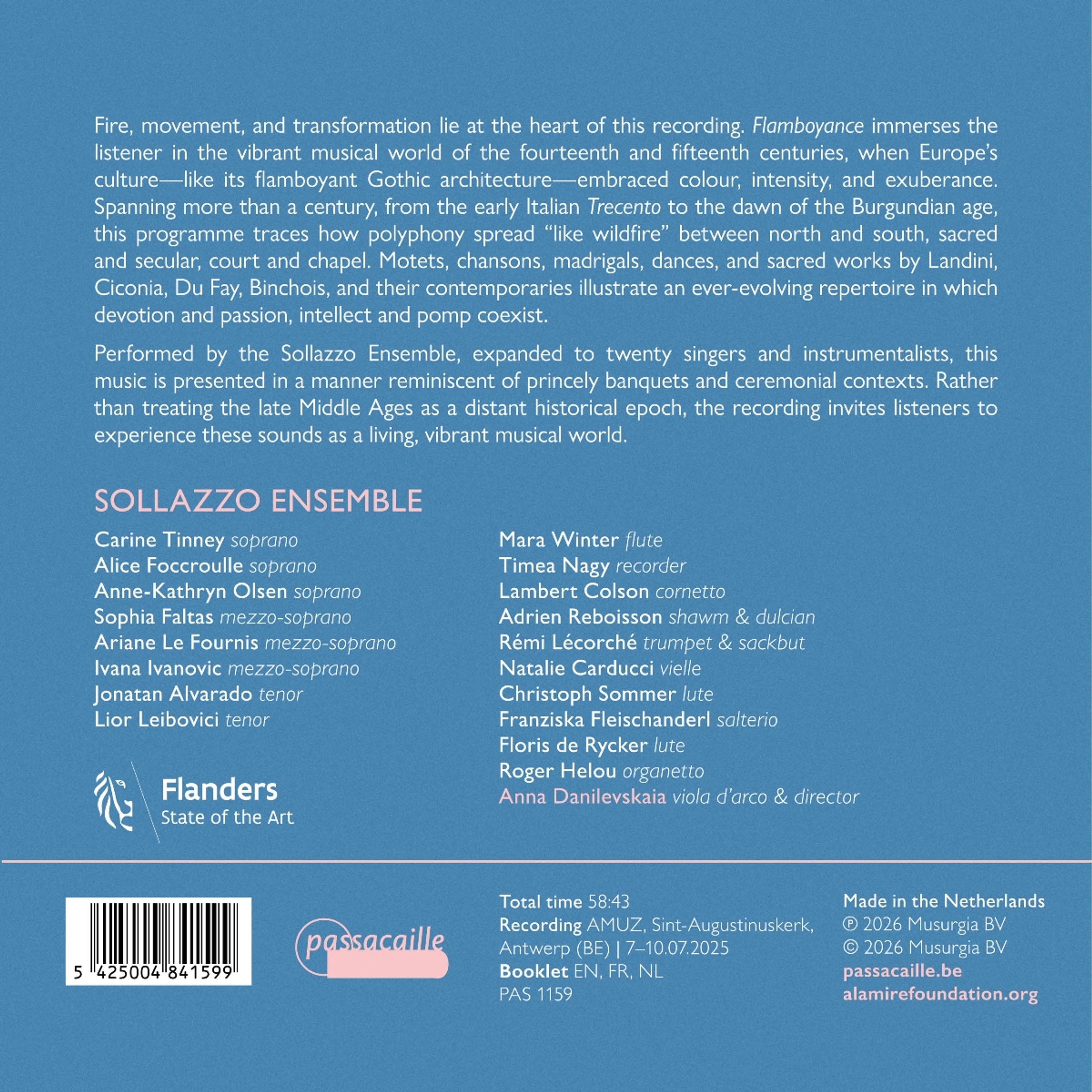 Feuer, Bewegung und Transformation stehen im Mittelpunkt dieser Aufnahme. "Flamboyance" lässt den Hörer in die pulsierende musikalische Welt des vierzehnten und fünfzehnten Jahrhunderts eintauchen, als die europäische Kultur - ähnlich wie die extravagante gotische Architektur - Farbe, Intensität und Überschwang anbot. Dieses Programm umspannt mehr als ein Jahrhundert, vom frühen italienischen Trecento bis zum Anbruch des burgundischen Zeitalters und zeichnet nach, wie sich die Polyphonie 'wie ein Lauffeuer' zwischen Nord und Süd, Kirche und Welt, Hof und Kapelle verbreitete. Motetten, Chansons, Madrigale, Tänze und geistliche Werke von Francesco Landini, Johannes Ciconia, Guillaume Du Fay, Gilles Binchois und ihren Zeitgenossen veranschaulichen ein sich ständig weiterentwickelndes Repertoire, in dem Hingabe und Leidenschaft, Intellekt und Pomp nebeneinander bestehen. Das Sollazzo-Ensemble, das auf zwanzig Sänger und Instrumentalisten angewachsen ist, präsentiert diese Musik in einer Weise, die an fürstliche Bankette und zeremonielle Kontexte erinnert. Die Aufnahme behandelt das Spätmittelalter nicht als eine ferne historische Epoche, sondern lädt den Hörer ein, diese Klänge als eine lebendige, pulsierende musikalische Welt zu erleben.