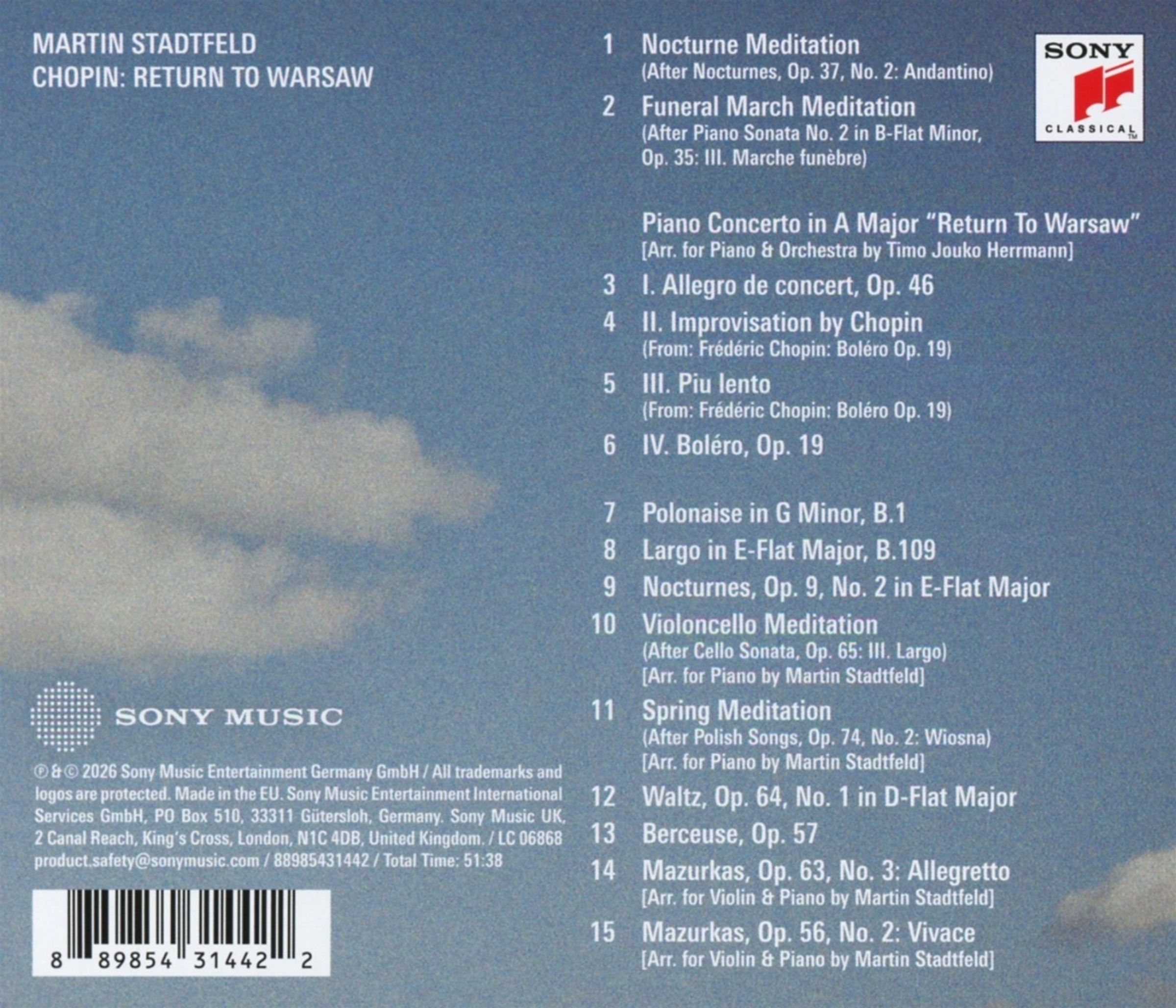 Wie würde sich Frédéric Chopins nie vollendetes drittes Klavierkonzert anhören? Vielleicht so, wie es sich Pianist Martin Stadtfeld gemeinsam mit dem Dirigenten und Arrangeur Timo Jouko Herrmann vorstellt. Das ursprünglich als groß angelegtes Konzert konzipierte »Allegro de concert« op. 46 erscheint auf dem Album »Chopin: Return to Warsaw« in einer Orchesterfassung, die Chopins Klangsprache mit größter stilistischer Sensibilität nachempfindet. Als perfektes Gegenstück erklingt Chopins selten gespielter »Bolero« op. 19 in einer ebenso behutsamen wie farbreichen Orchestrierung. Zusammen bilden sie das rekonstruierte Konzert in A-Dur, gespielt von Martin Stadtfeld und begleitet von den Heidelberger Sinfonikern unter T. J. Herrmann. Ergänzt wird das Programm u. a. durch bekannte Nocturnes, Walzer, die »Berceuse« und Stadtfelds eigene Bearbeitungen Chopin’scher Stücke.